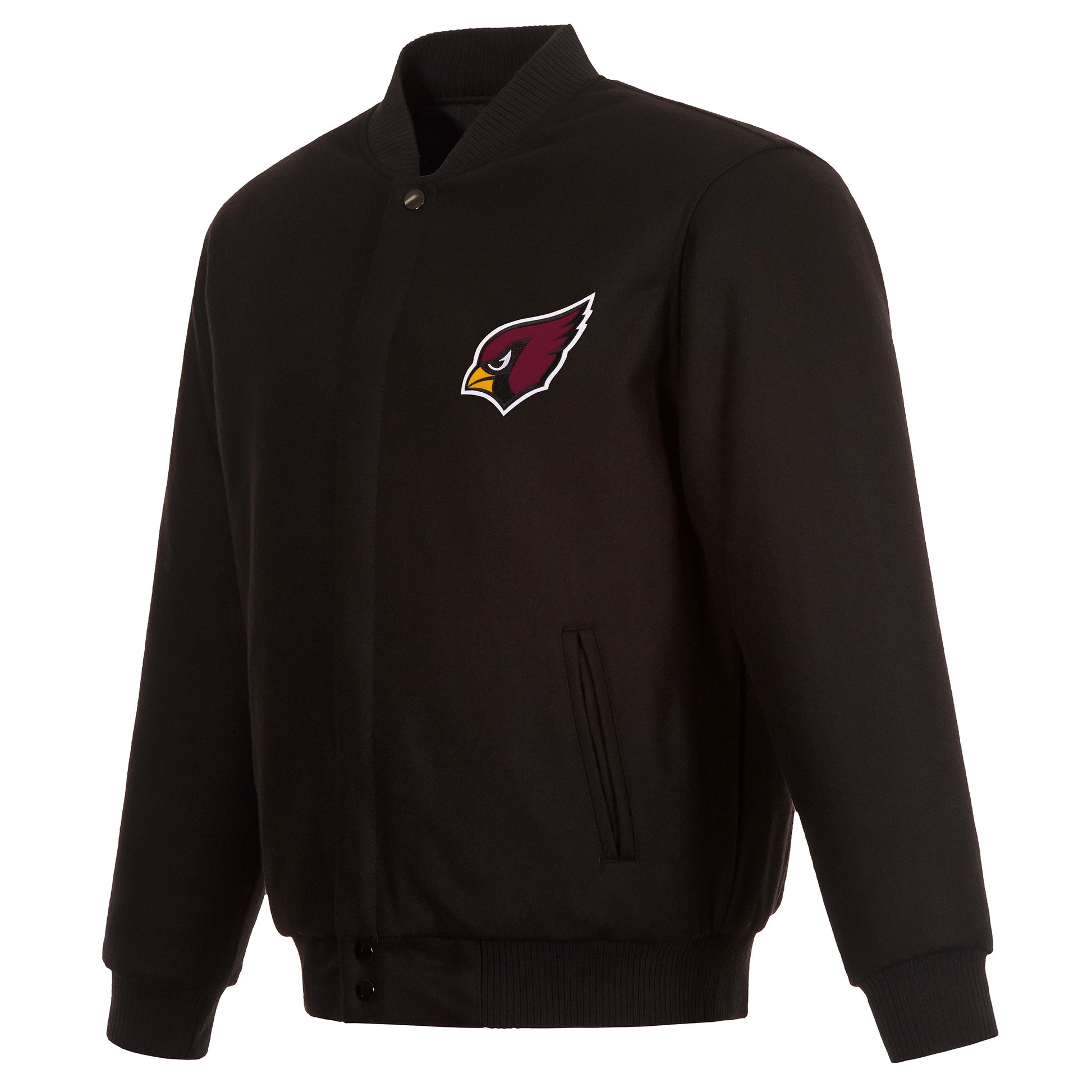 Arizona Cardinals All Wool Jacket with nylon lining in black with embroidered logos. Assembled in the USA. 55% wool 45% polyester body. Snap button closure.