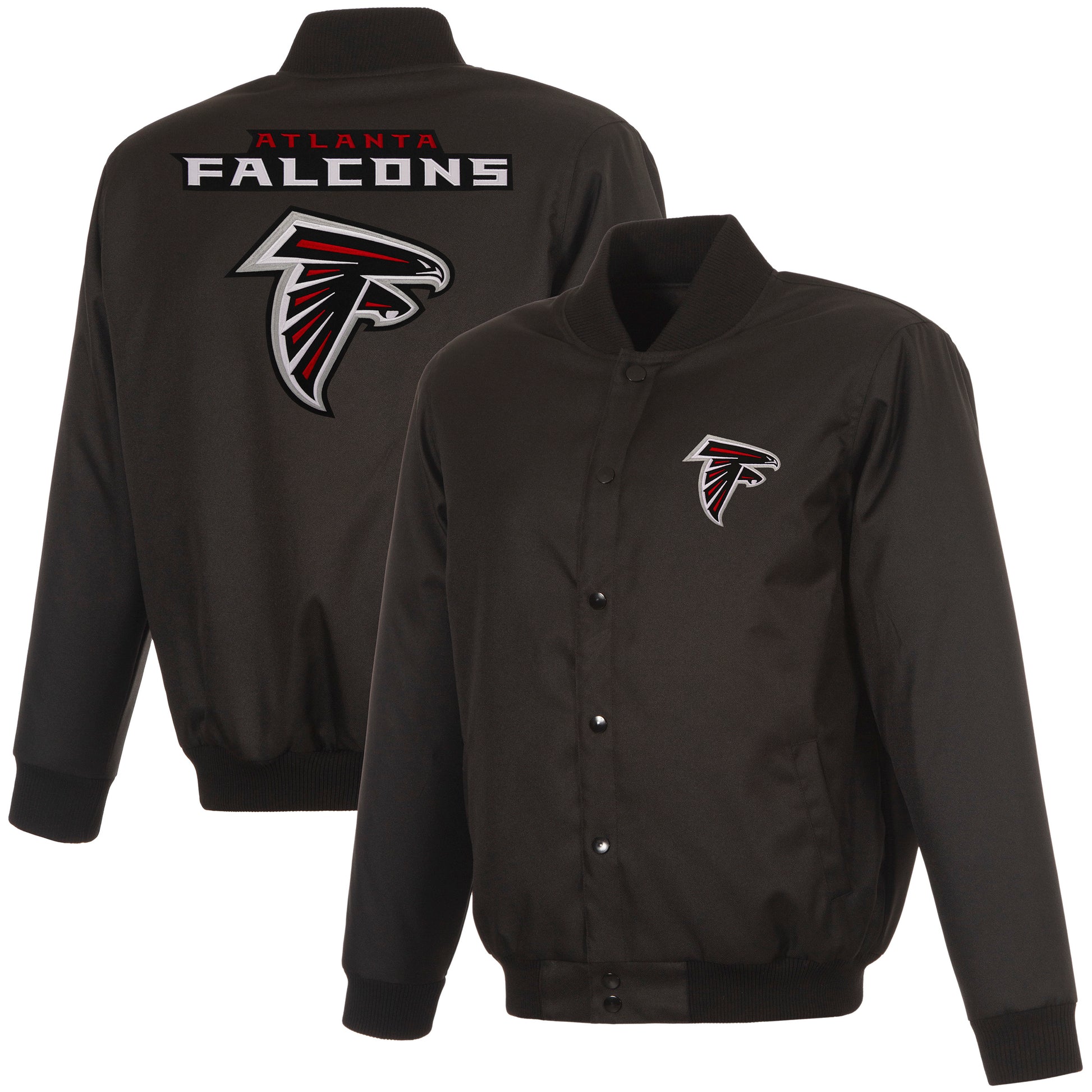 Atlanta Falcons poly-twill jacket in black-red with quilted nylon lining and embroidered appliqué logos.