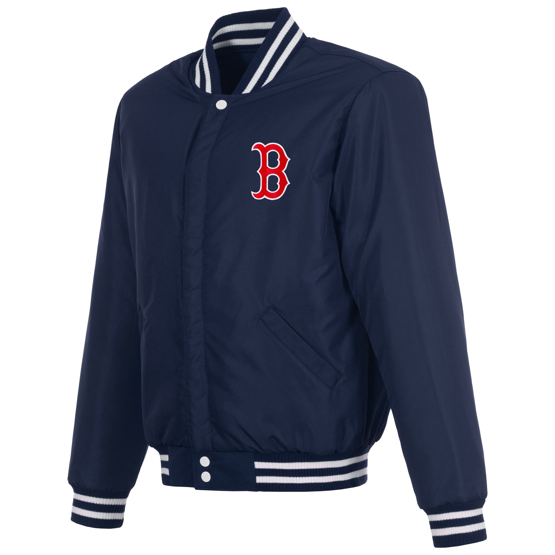Boston Red Sox reversible fleece jacket with Faux Leather sleeves in navy and white with nylon lining and embroidered logos. (Front and Back Logos)
