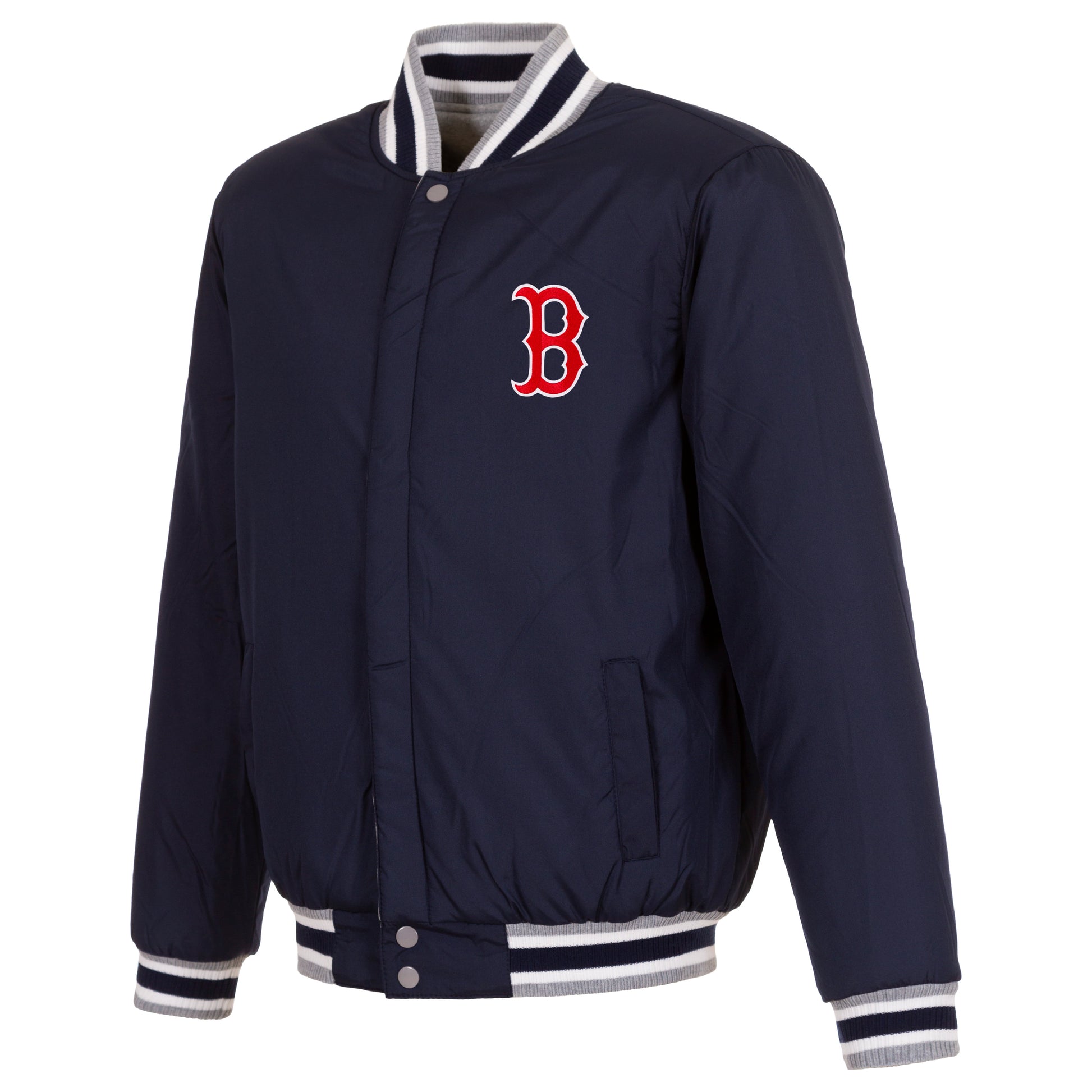 Boston Red Sox reversible two-tone fleece jacket in gray and navy with nylon lining and embroidered logos.