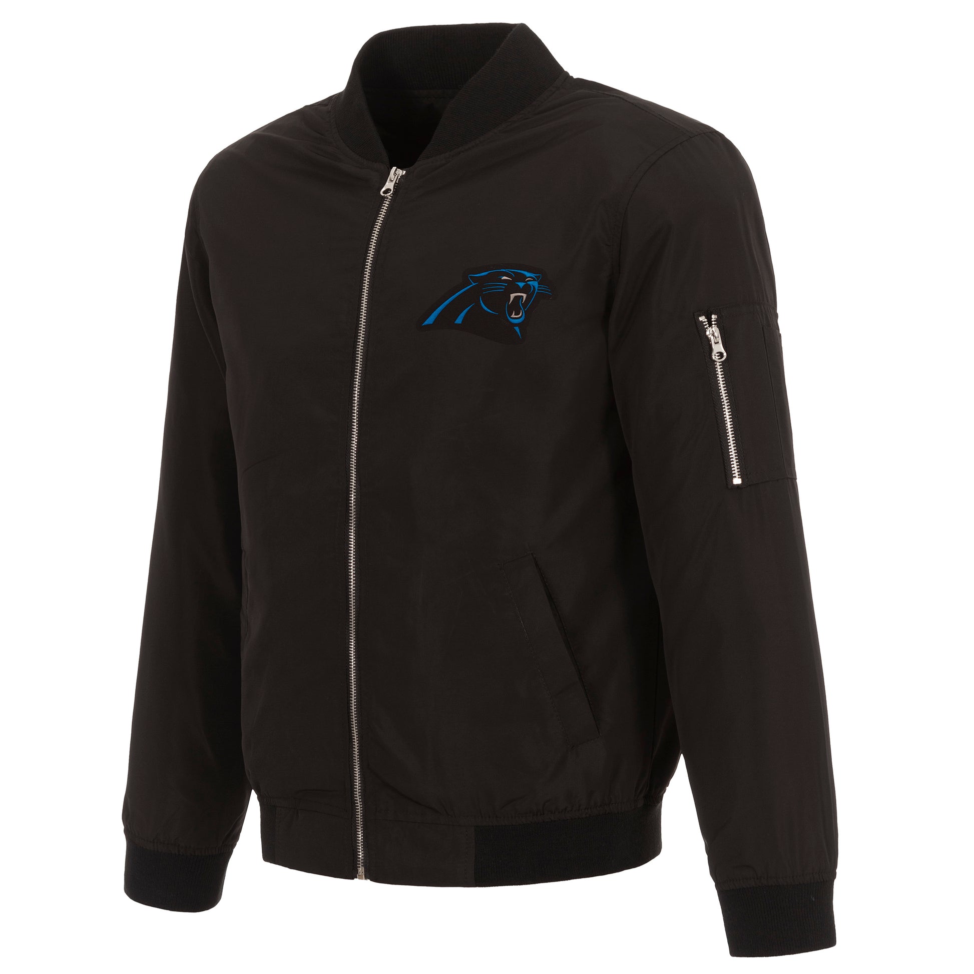Carolina Panthers nylon bomber in black with embroidered logos. Assembled in the USA. 100% Nylon, full length zip front.