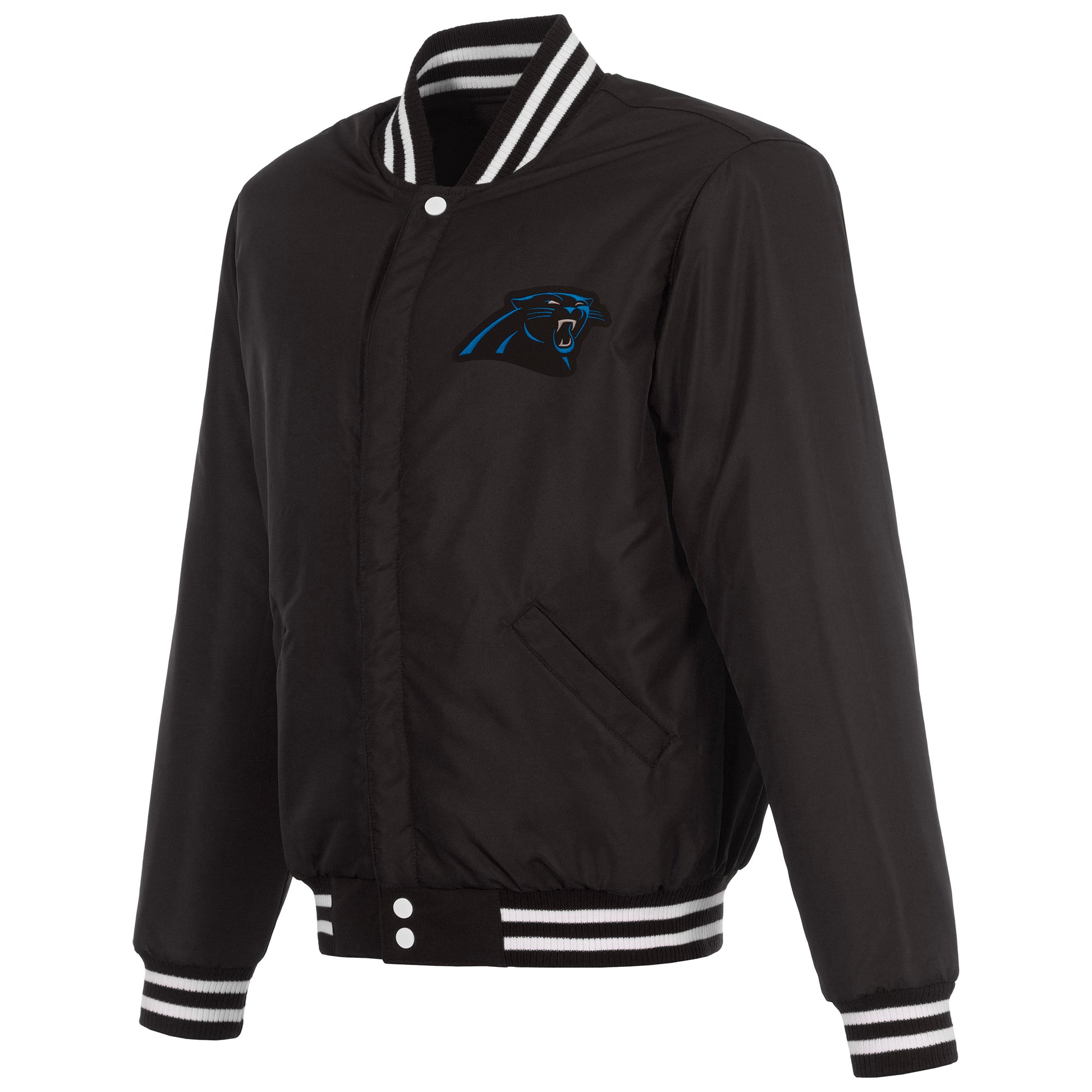 Carolina Panthers reversible fleece jacket with faux leather sleeves in black and white with embroidered logos. Assembled in the USA. 100% polyester body, faux leather sleeves, snap button closure.