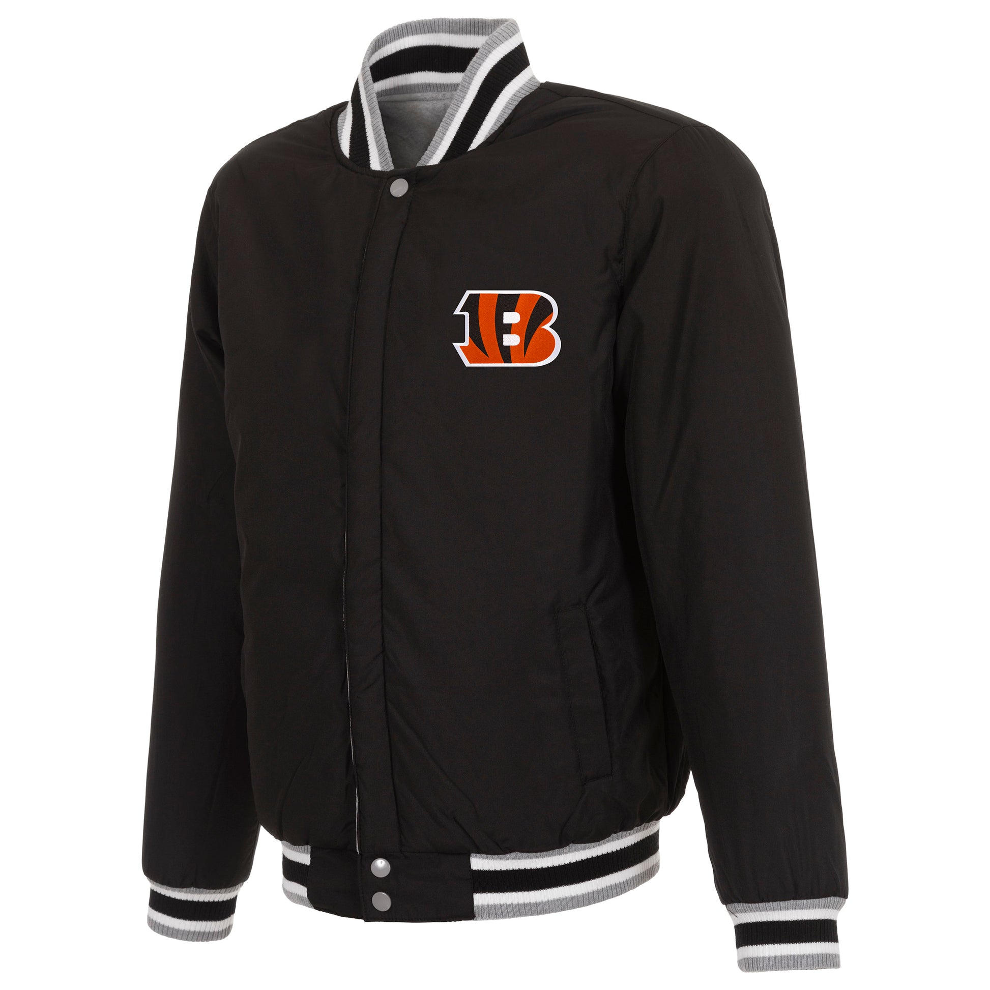 Cincinnati Bengals reversible two-tone fleece jacket in grey and black with embroidered logos. Assembled in the USA. 100% polyester body, reverse nylon side, snap button closure.