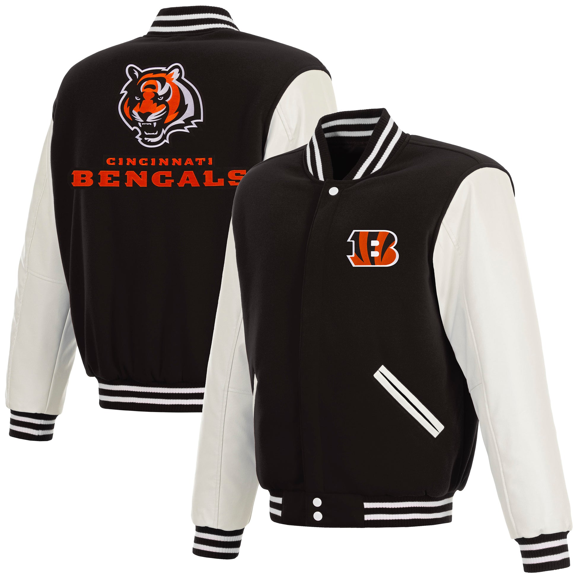 Cincinnati Bengals reversible fleece jacket with faux leather sleeves in navy-white with nylon lining and embroidered logos.