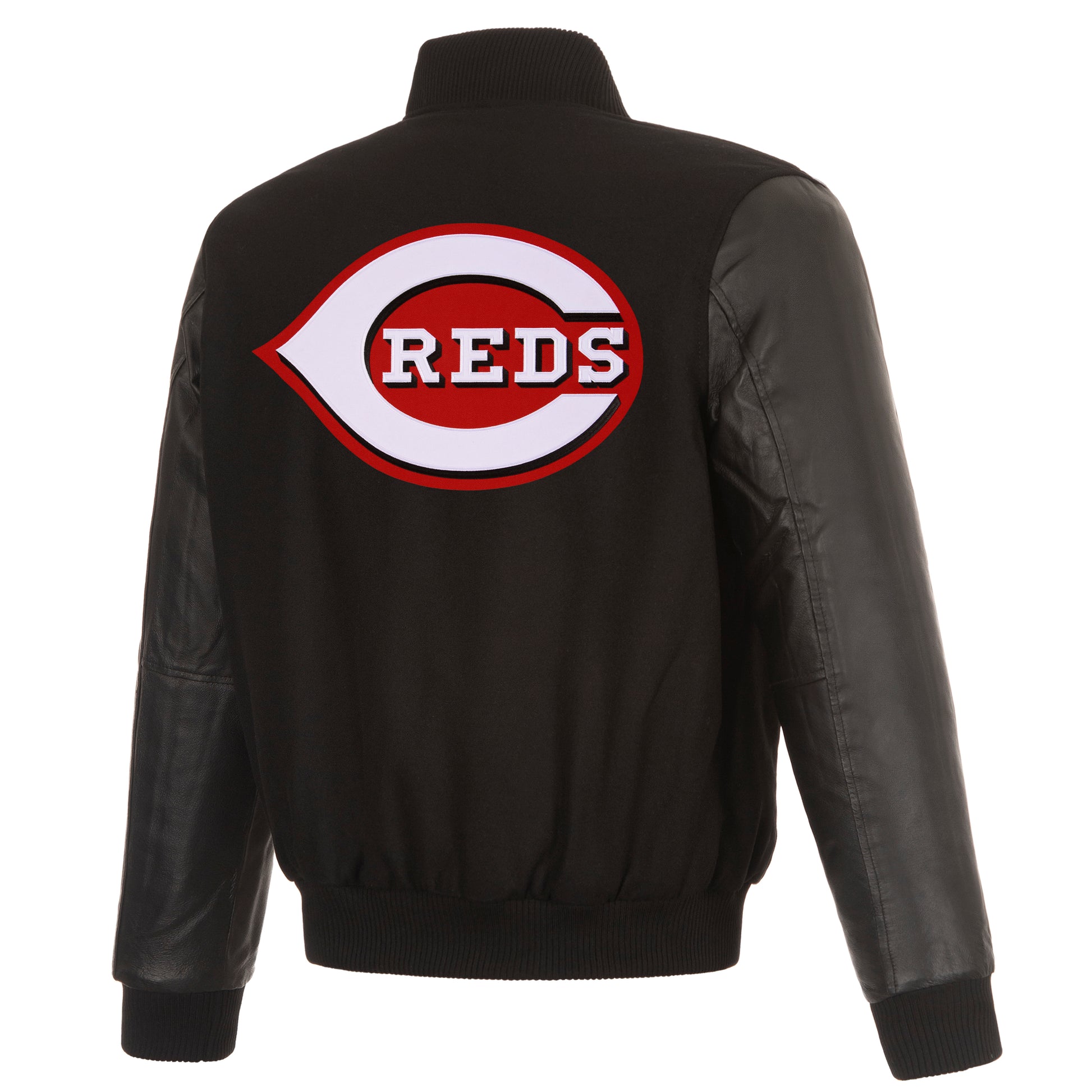 Cincinnati Reds reversible wool body and leather sleeves jacket in black with nylon lining and embroidered logos.