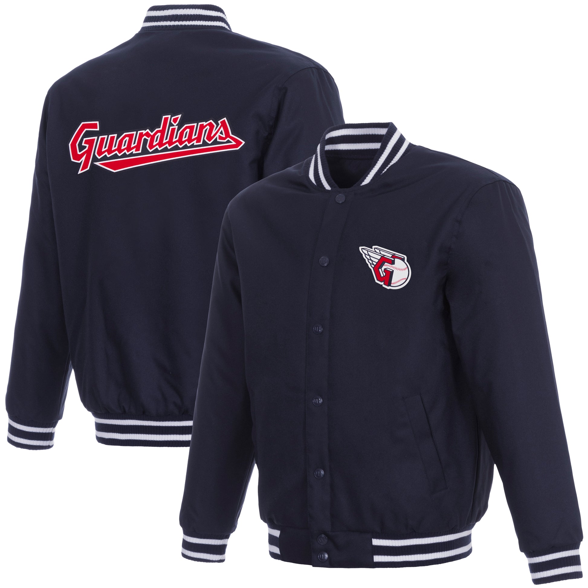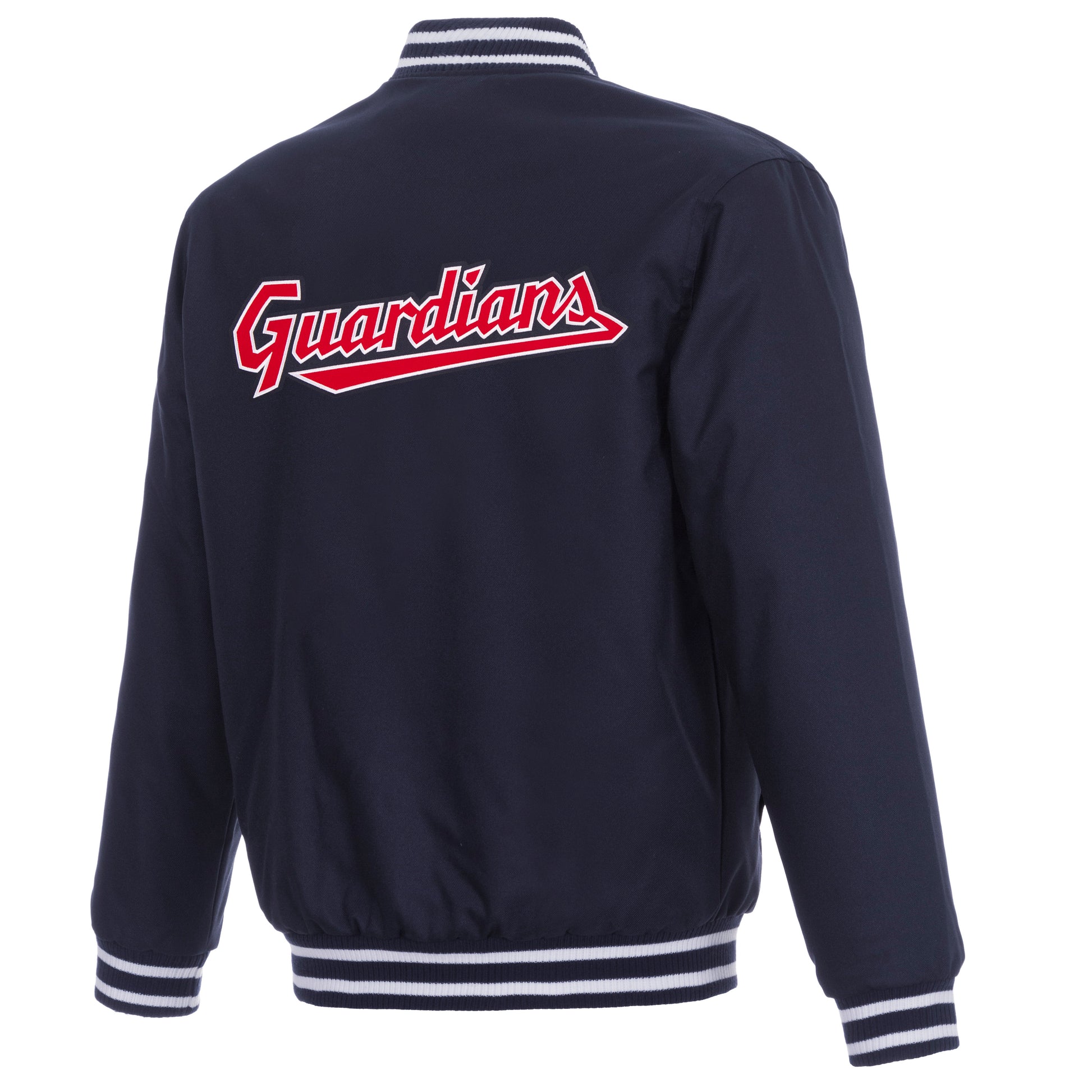 Cleveland Guardians poly-twill jacket in navy with quilted nylon lining and embroidered appliqué logos.
