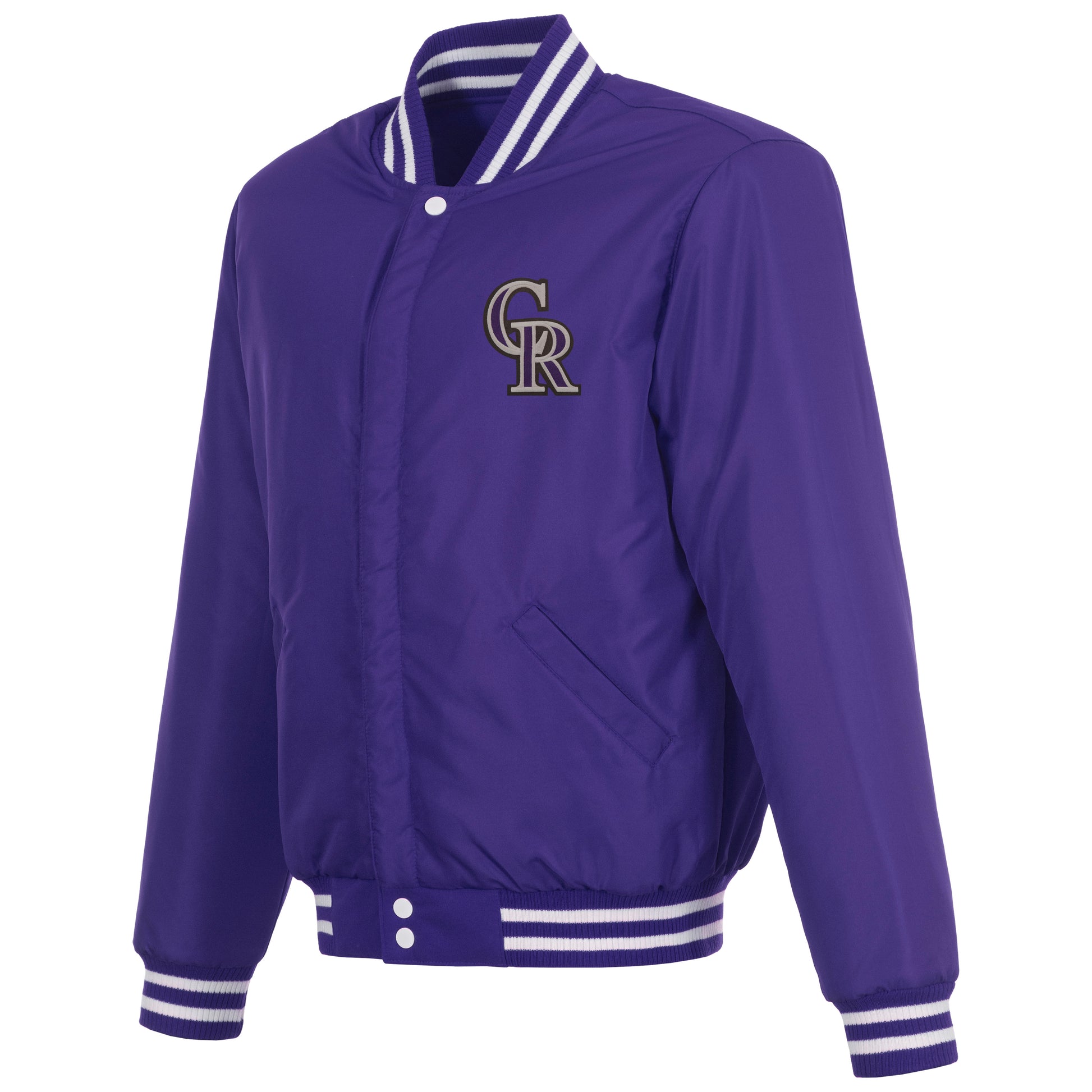 Colorado Rockies Reversible Varsity Jacket with faux leather sleeves in purple and white with embroidered logos. Assembled in the USA. 100% Polyester body, faux leather sleeves, snap button closure.