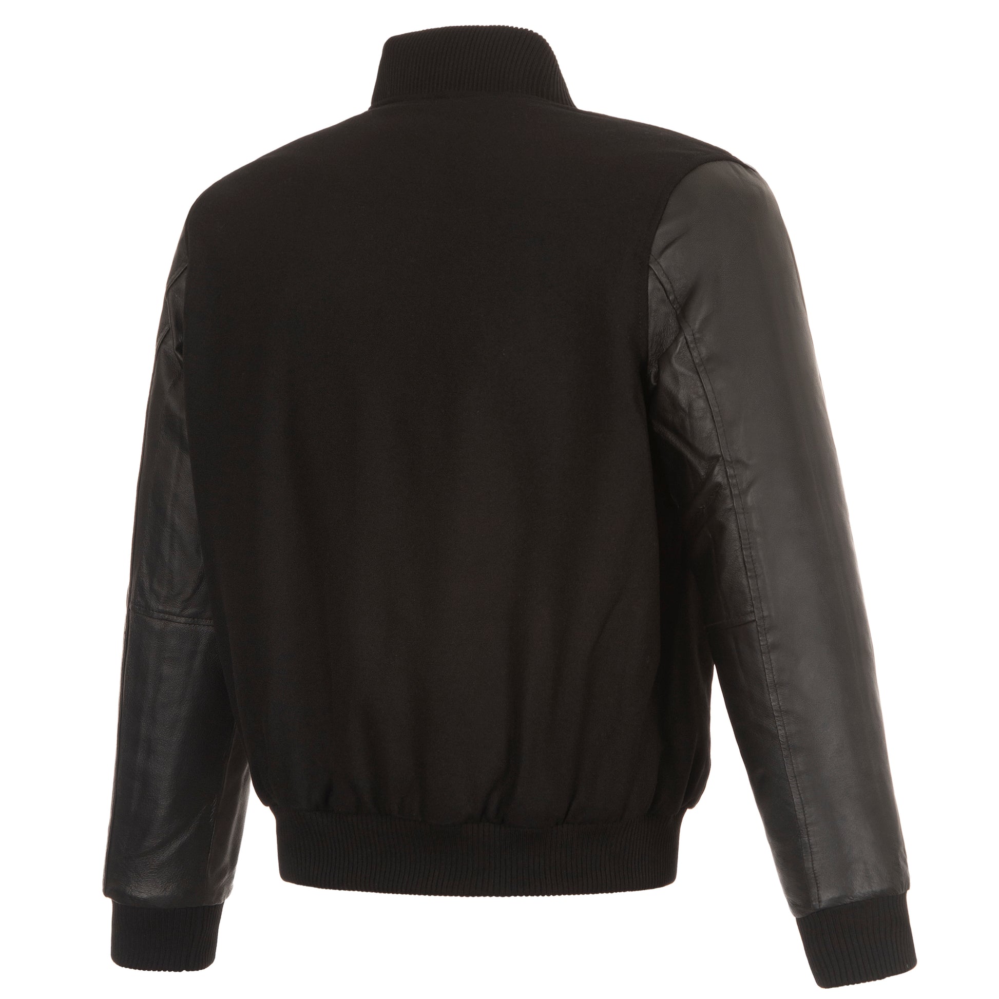 Colorado Rockies reversible wool body and leather sleeves jacket in black with quilted lining and embroidered appliqué logos.