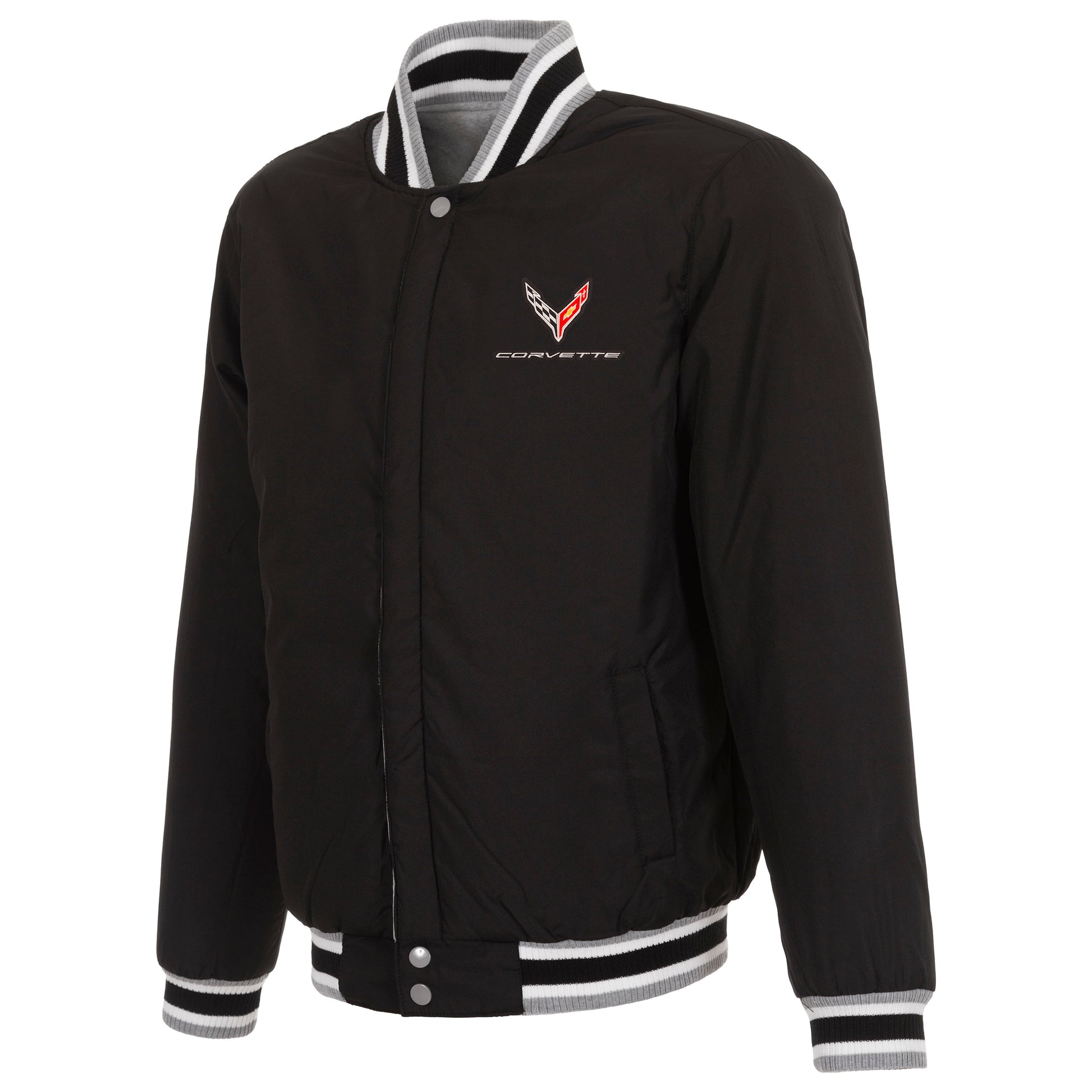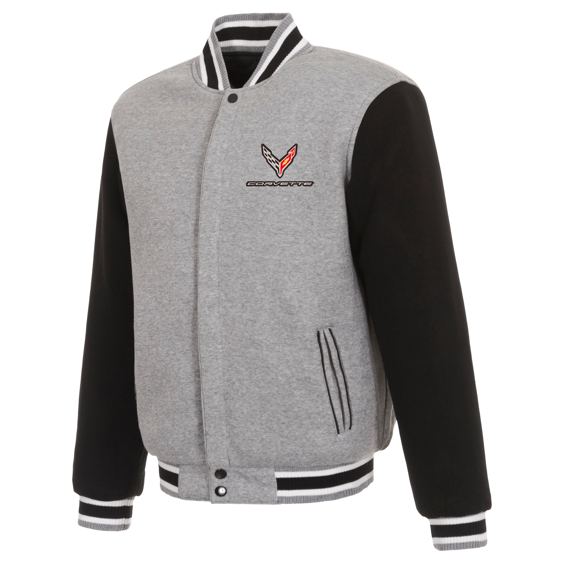 Corvette C8 Reversible Two-Tone Fleece Jacket in gray and black with nylon lining and embroidered logos.