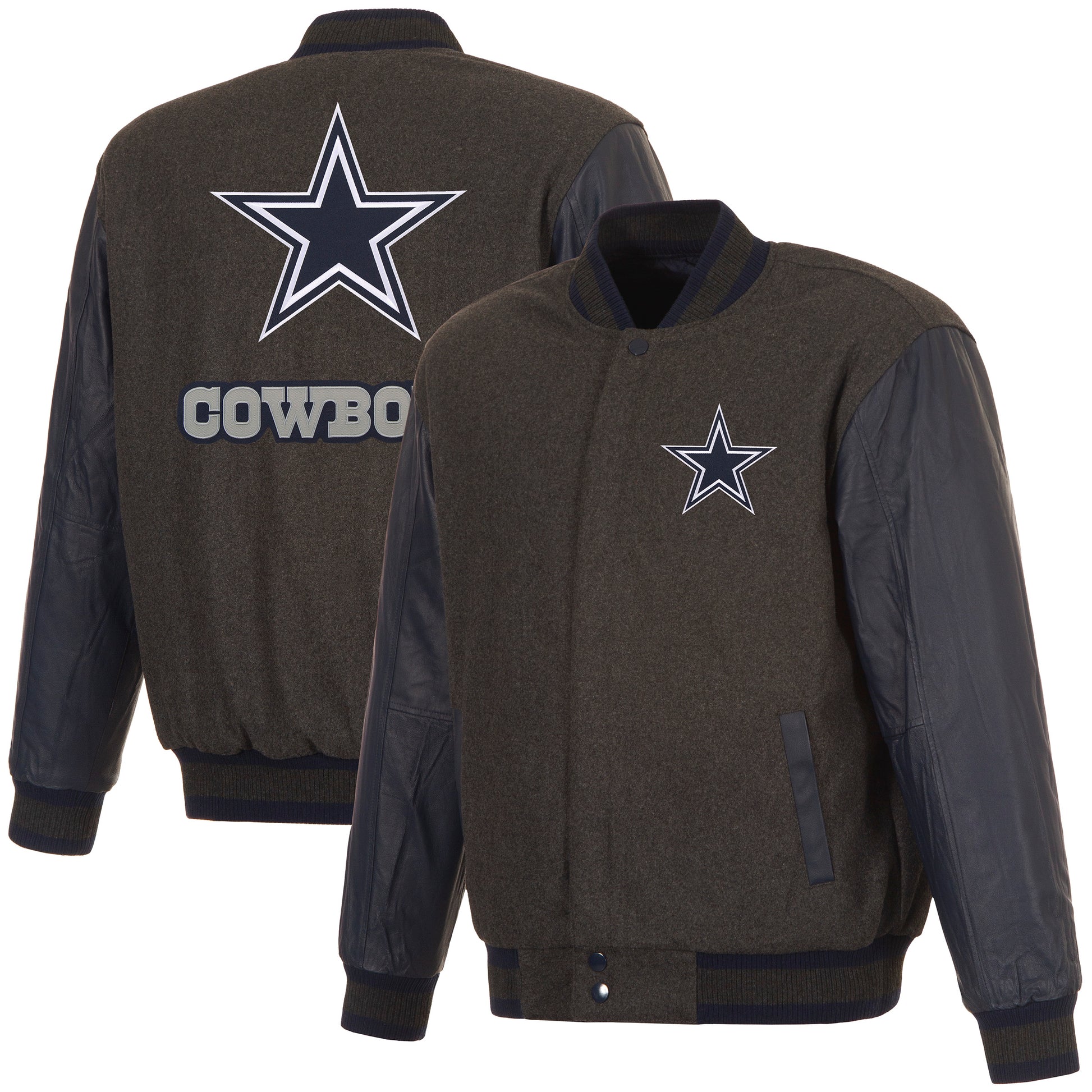 Dallas Cowboys reversible wool body and leather sleeves jacket in charcoal and navy with nylon lining and embroidered logos.