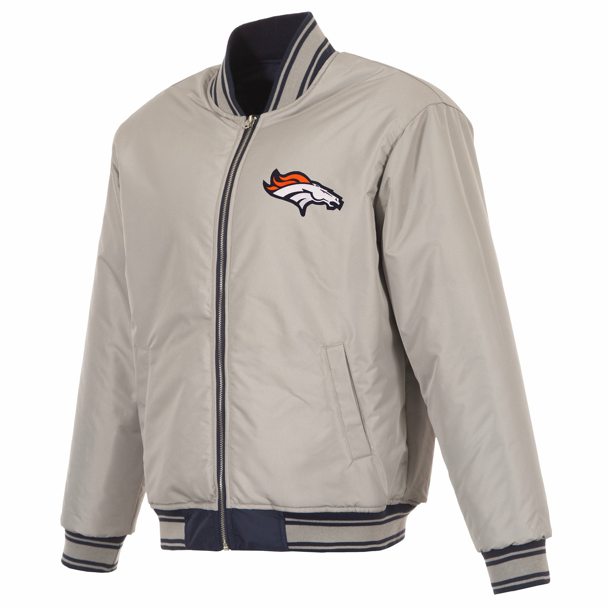 Denver Broncos reversible nylon bomber in navy and grey with embroidered logos. Assembled in the USA. 100% Nylon, full length zip front.