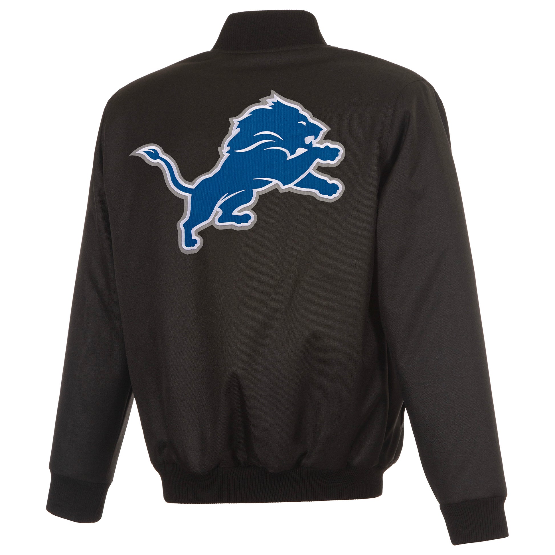Detroit Lions Poly-Twill Jacket with quilted nylon lining black with embroidered logos. Assembled in the USA. 100% Polyester body. Snap button closure.