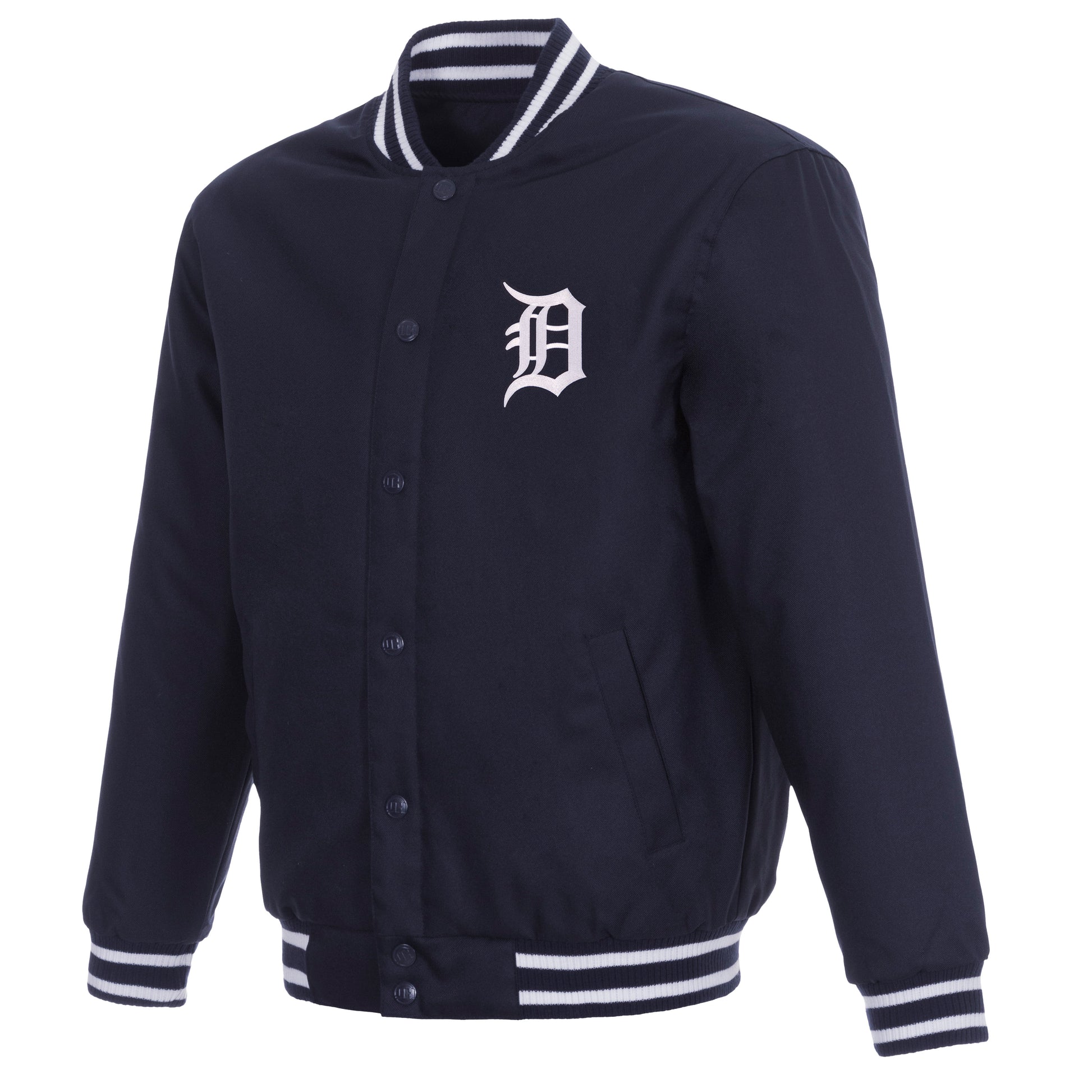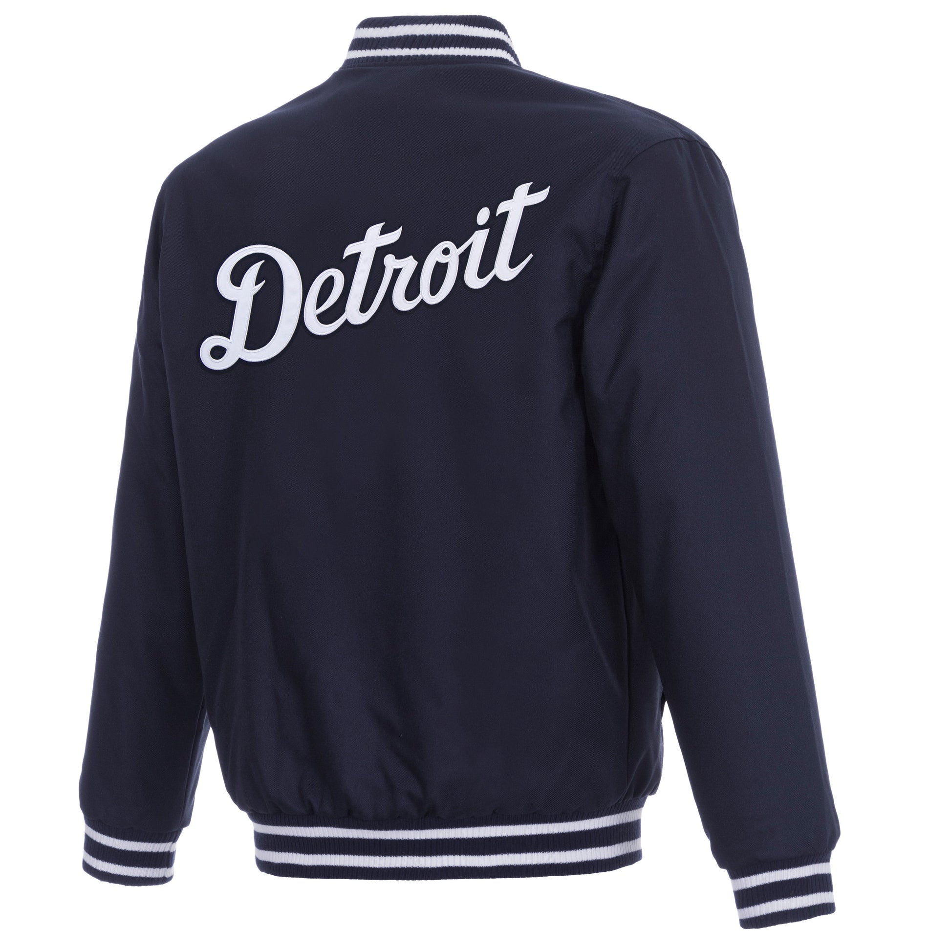 Detroit Tigers poly-twill jacket in navy with quilted nylon lining and embroidered appliqué logos.