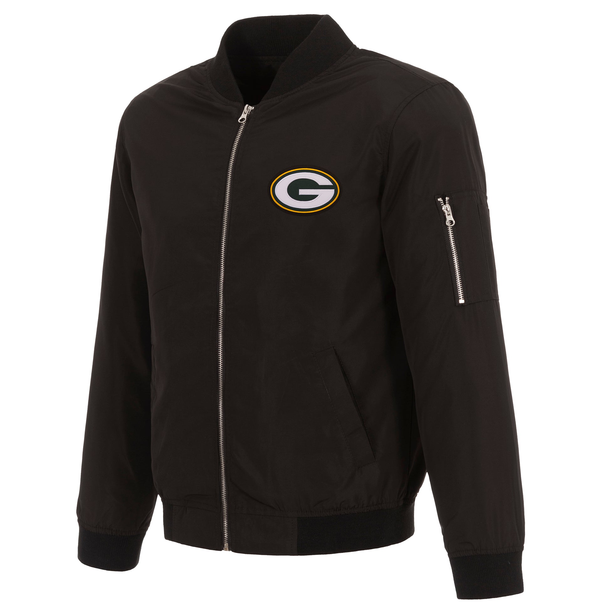 Green Bay Packers nylon bomber in black with embroidered logos. Assembled in the USA. 100% Nylon, full length zip front.