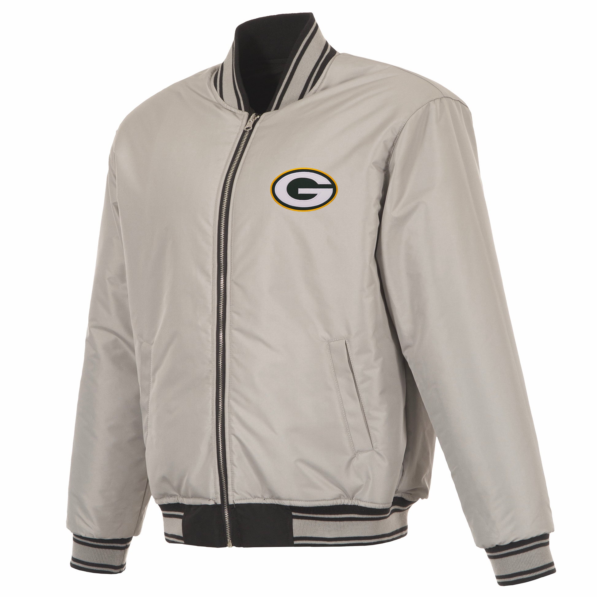 Green Bay Packers reversible nylon bomber in black and grey with embroidered logos. Assembled in the USA. 100% Nylon, full length zip front.