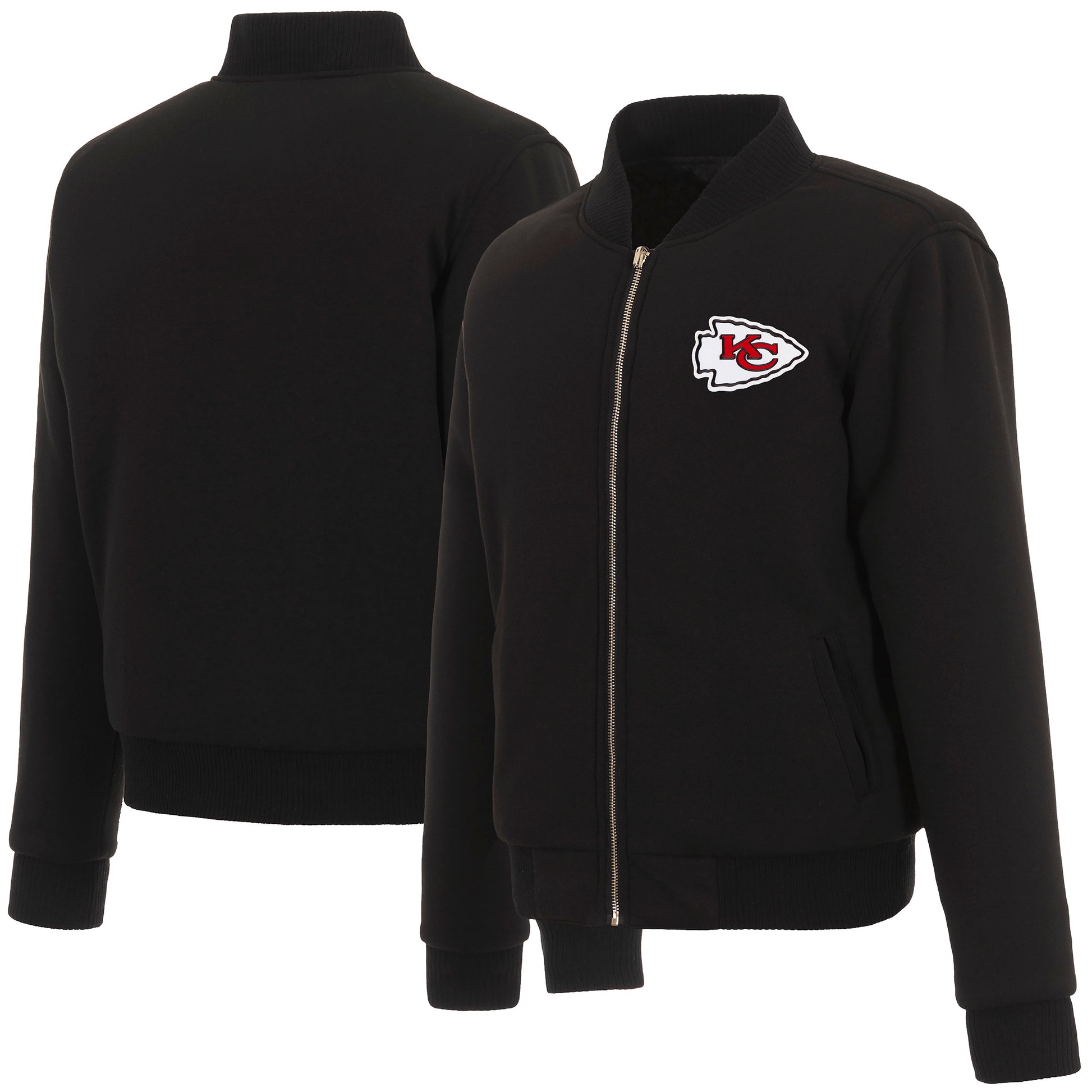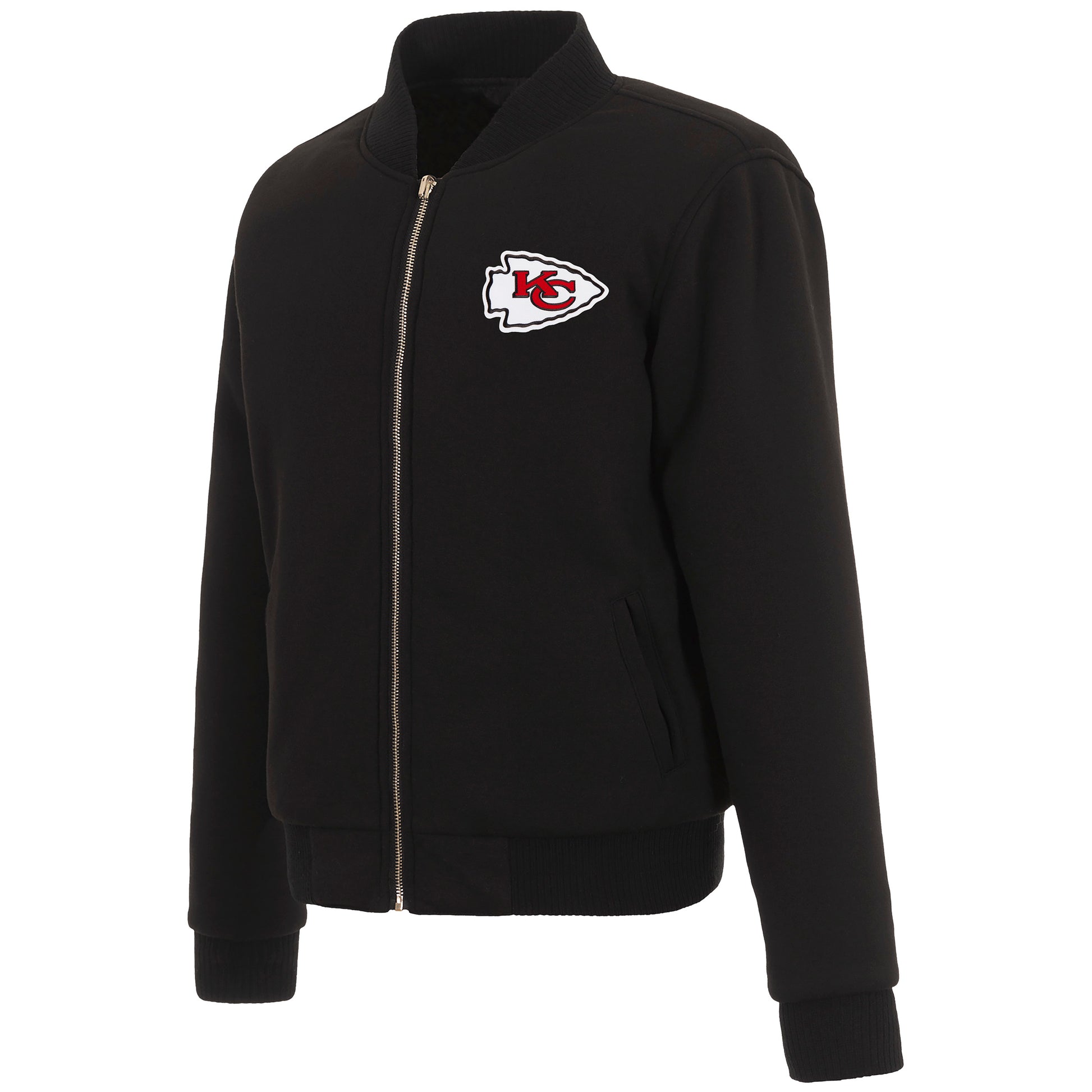 Kansas City Chiefs Ladies reversible fleece jacket in black with embroidered logos. Assembled in the USA. 100% polyester body, reverse nylon side, metal zip closure.