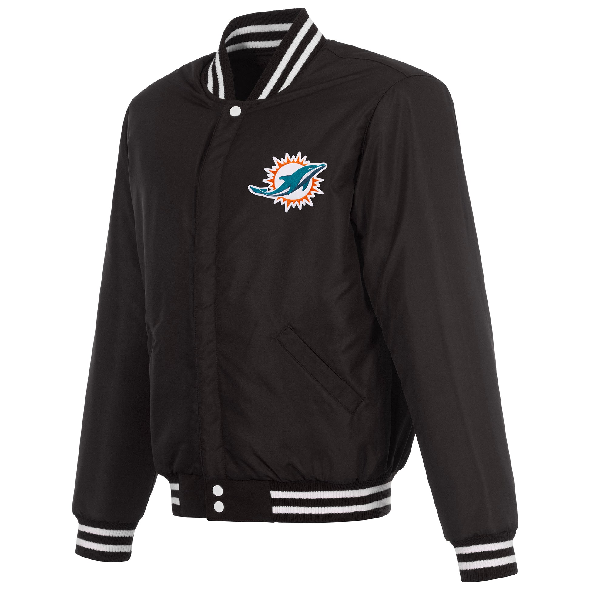 Miami Dolphins reversible fleece jacket with faux leather sleeves in black and white with embroidered logos. Assembled in the USA. 100% polyester body, faux leather sleeves, snap button closure.