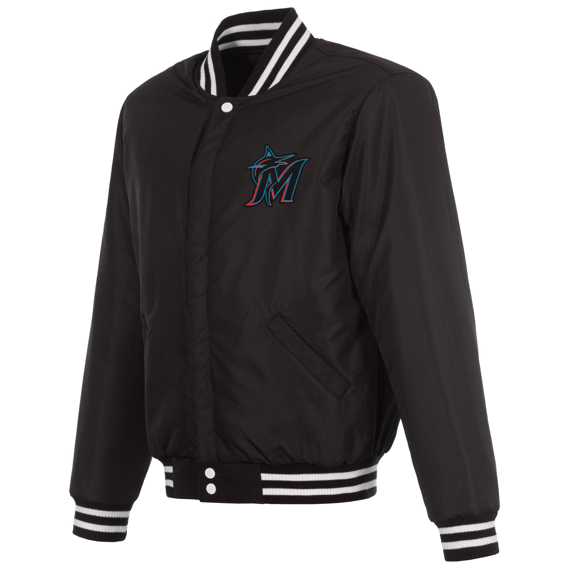 Miami Marlins reversible fleece jacket with Faux Leather sleeves in black and white with nylon lining and embroidered logos.