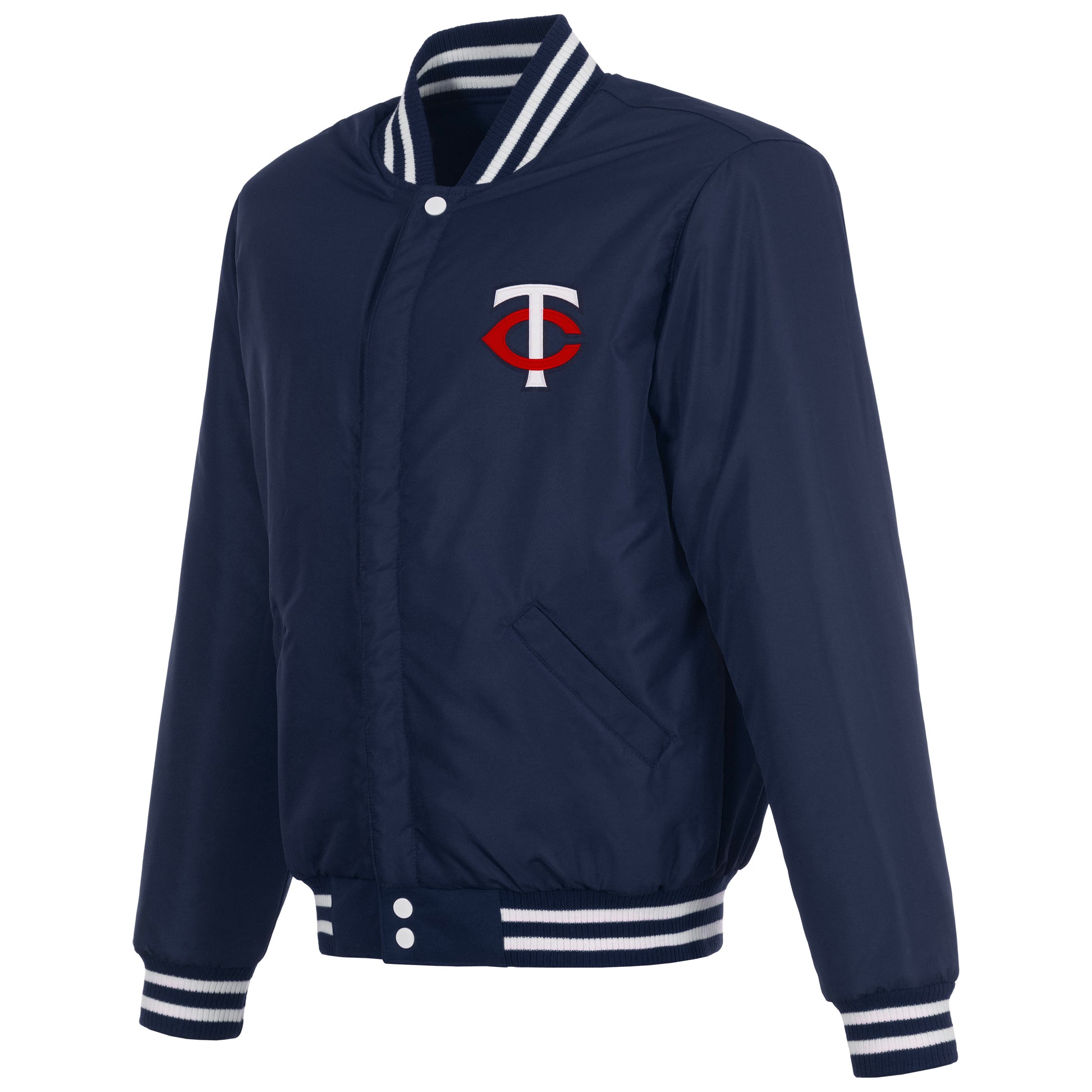Minnesota Twins reversible fleece jacket with Faux Leather sleeves in navy and white with nylon lining and embroidered logos.