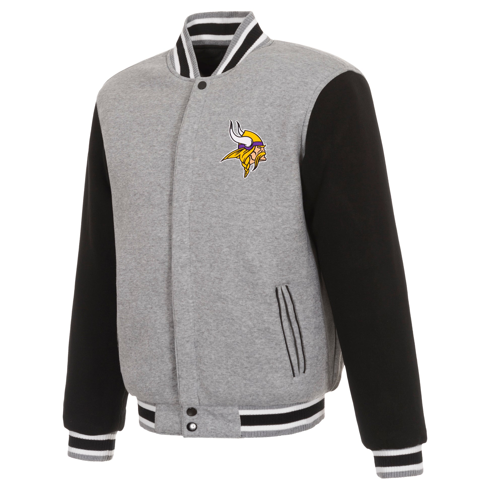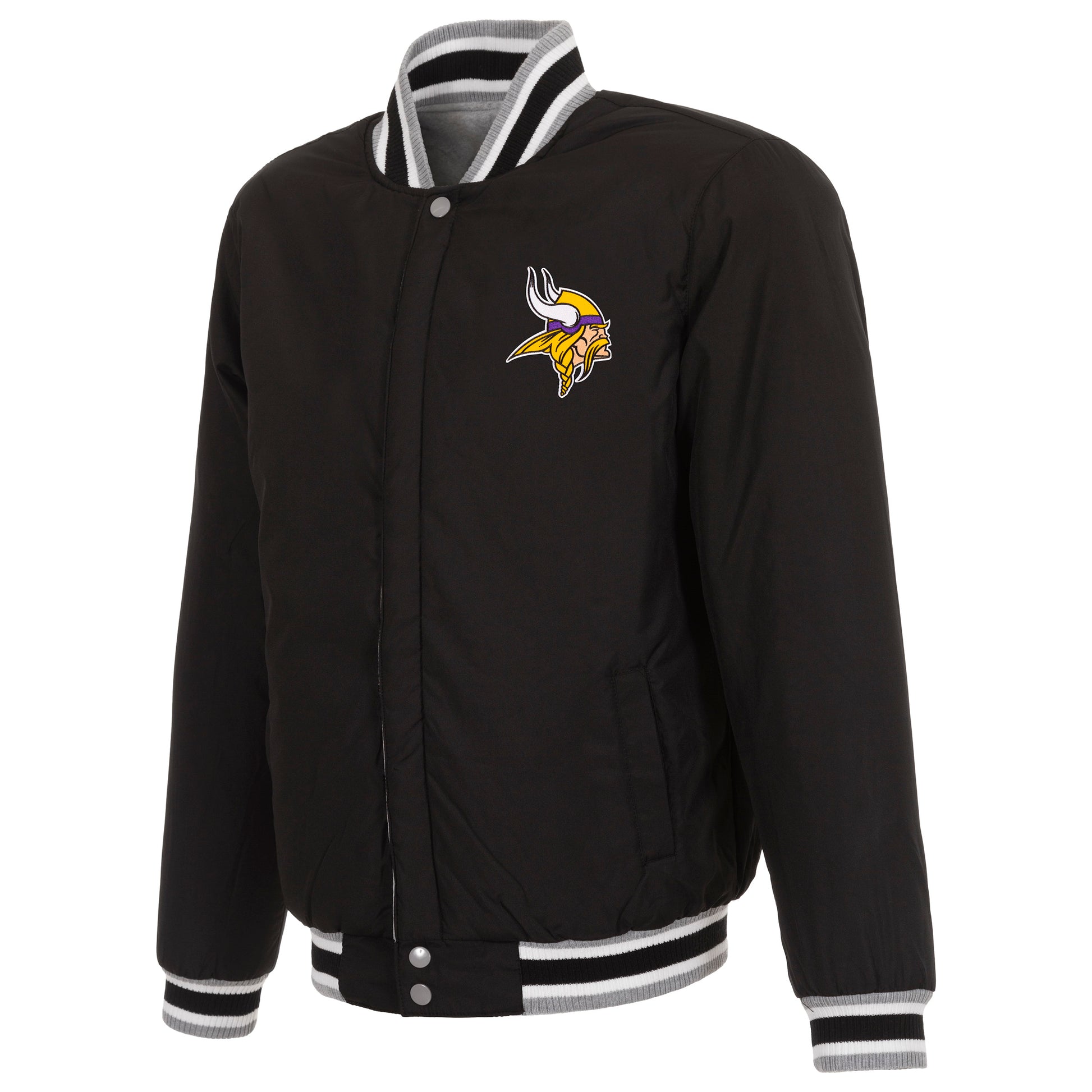 Minnesota Vikings reversible two-tone fleece jacket in black and white with embroidered logos. Assembled in the USA. 100% polyester body, reverse nylon side, snap button closure.