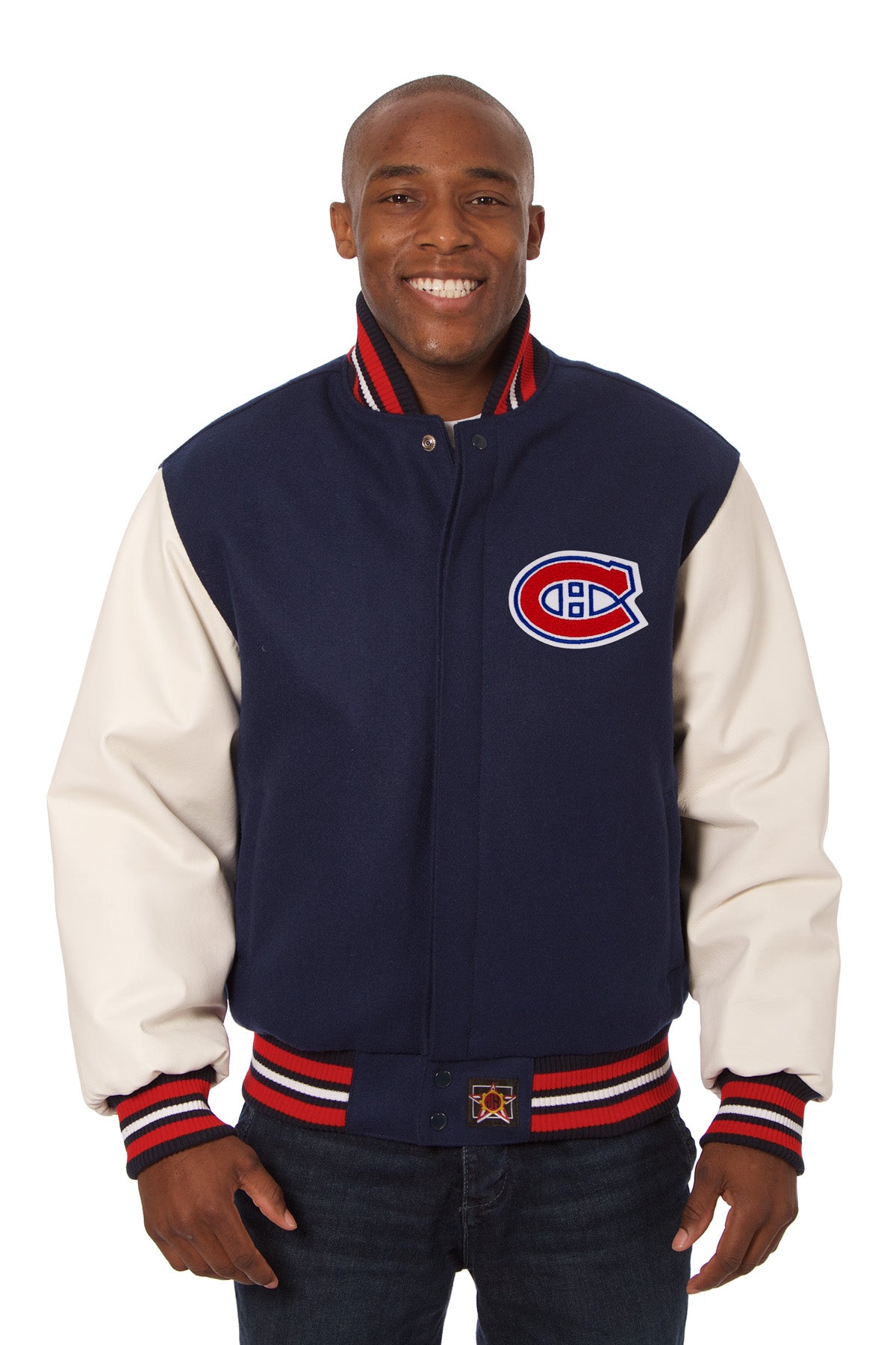 Montreal Canadiens embroidered wool and leather varsity jacket in navy and white with navy, red and white ribbing.