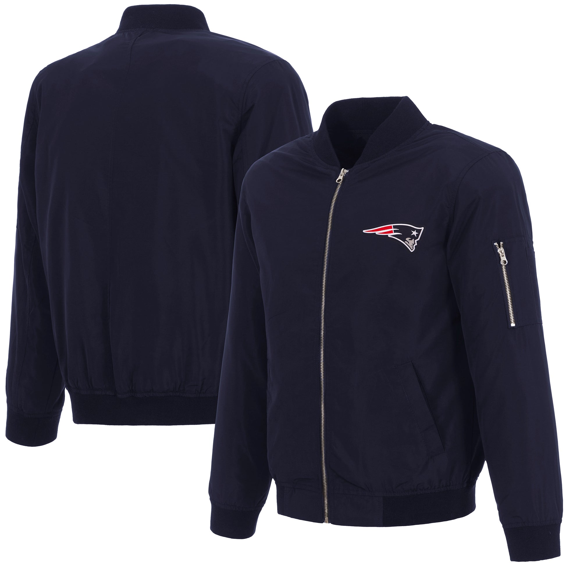 New England Patriots nylon bomber in navy with embroidered logos. Assembled in the USA. 100% Nylon, full length zip front.