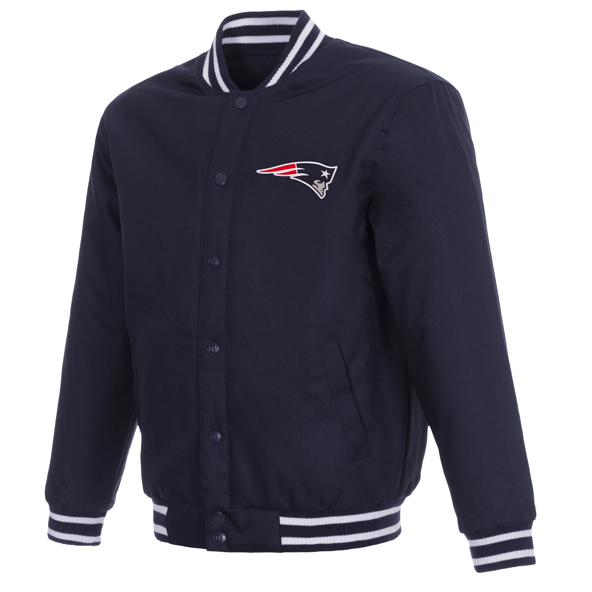 New England Patriots poly-twill jacket in navy with quilted nylon lining and embroidered appliqué logos.