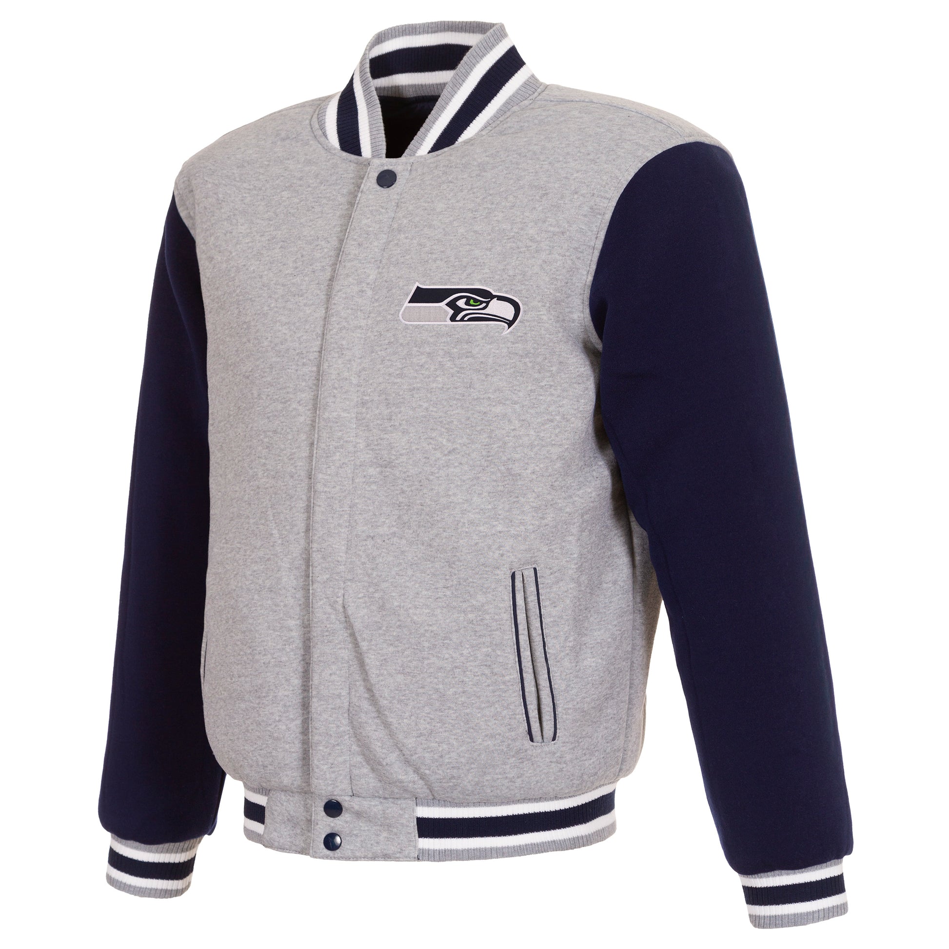 New England Patriots reversible two-tone fleece jacket in navy and white with embroidered logos. Assembled in the USA. 100% polyester body, reverse nylon side, snap button closure.