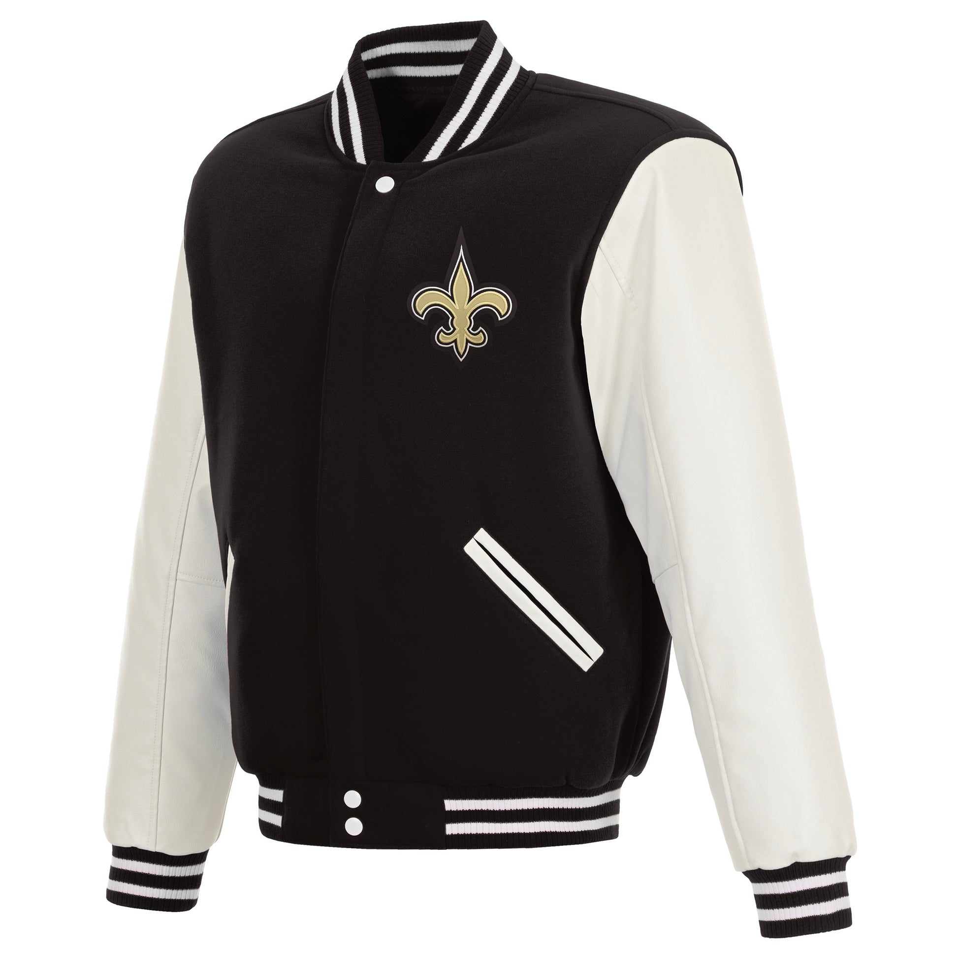 New Orleans Saints reversible fleece jacket with faux leather sleeves in black and white with embroidered logos. Assembled in the USA. 100% polyester body, faux leather sleeves, snap button closure.