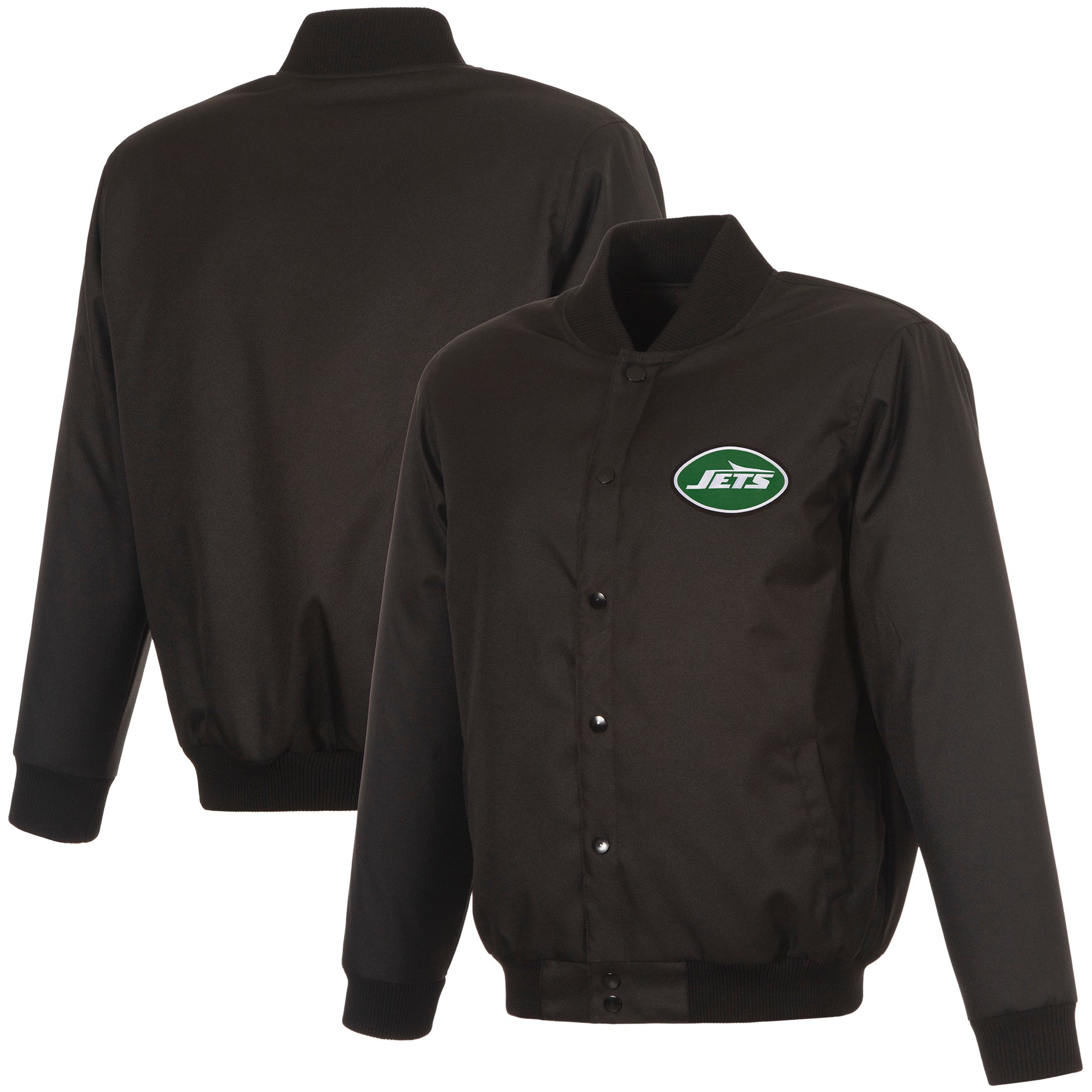 New York Jets Poly-Twill Jacket with quilted nylon lining in black with embroidered logos. Assembled in the USA. 100% polyester body. Snap button closure.