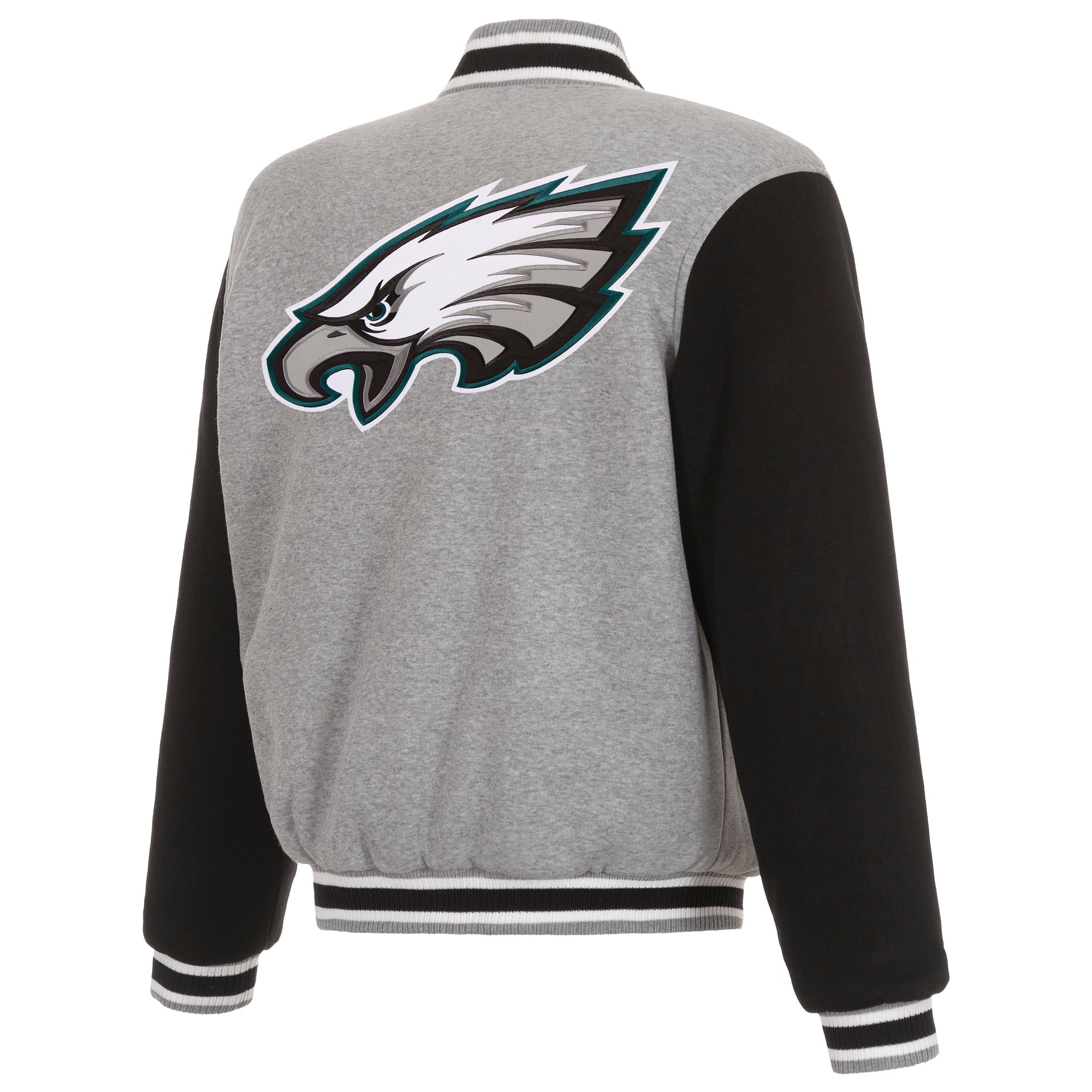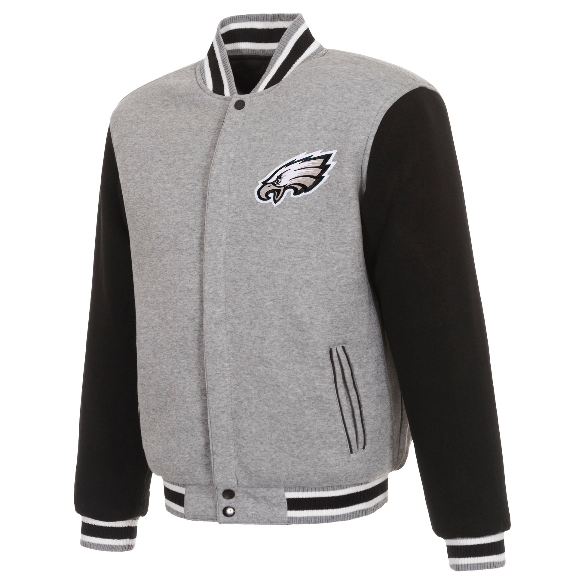 Philadelphia Eagles reversible two-tone fleece jacket in grey and black with embroidered logos. Assembled in the USA. 100% polyester body, reverse nylon side, snap button closure.