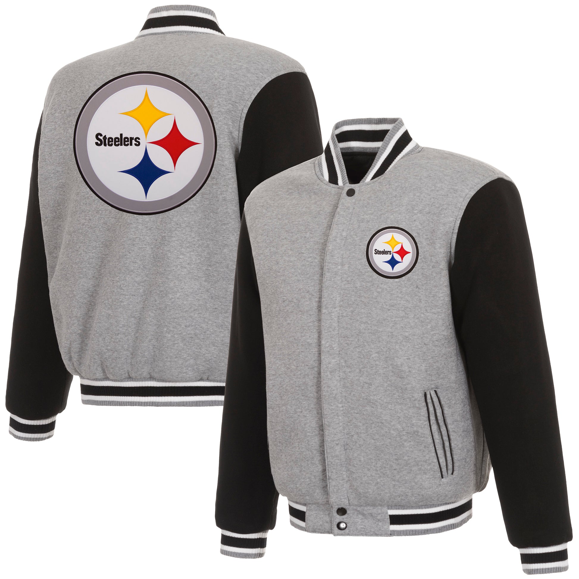 Pittsburgh Steelers reversible two-tone fleece jacket in grey and black with embroidered logos. Assembled in the USA. 100% polyester body, reverse nylon side, snap button closure.