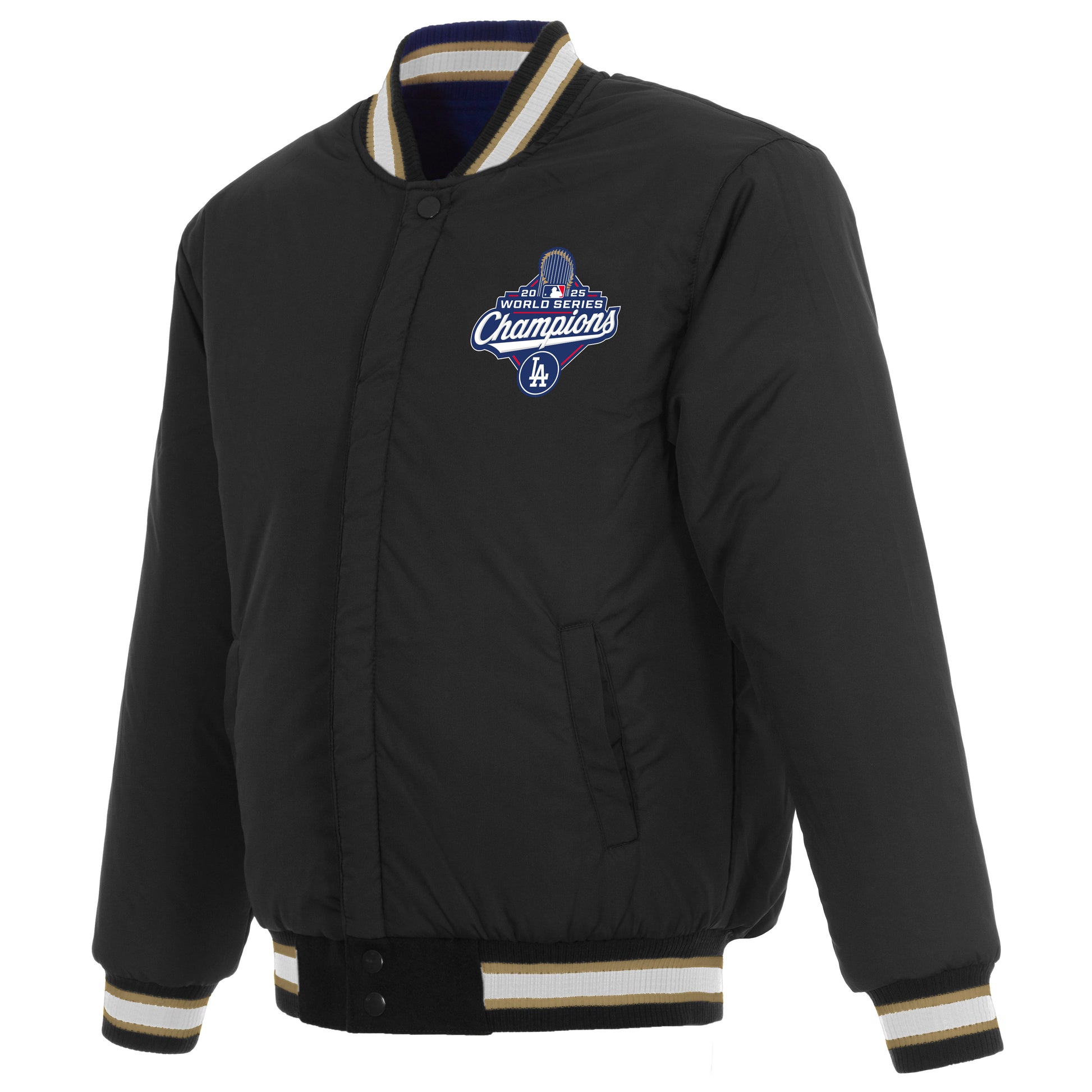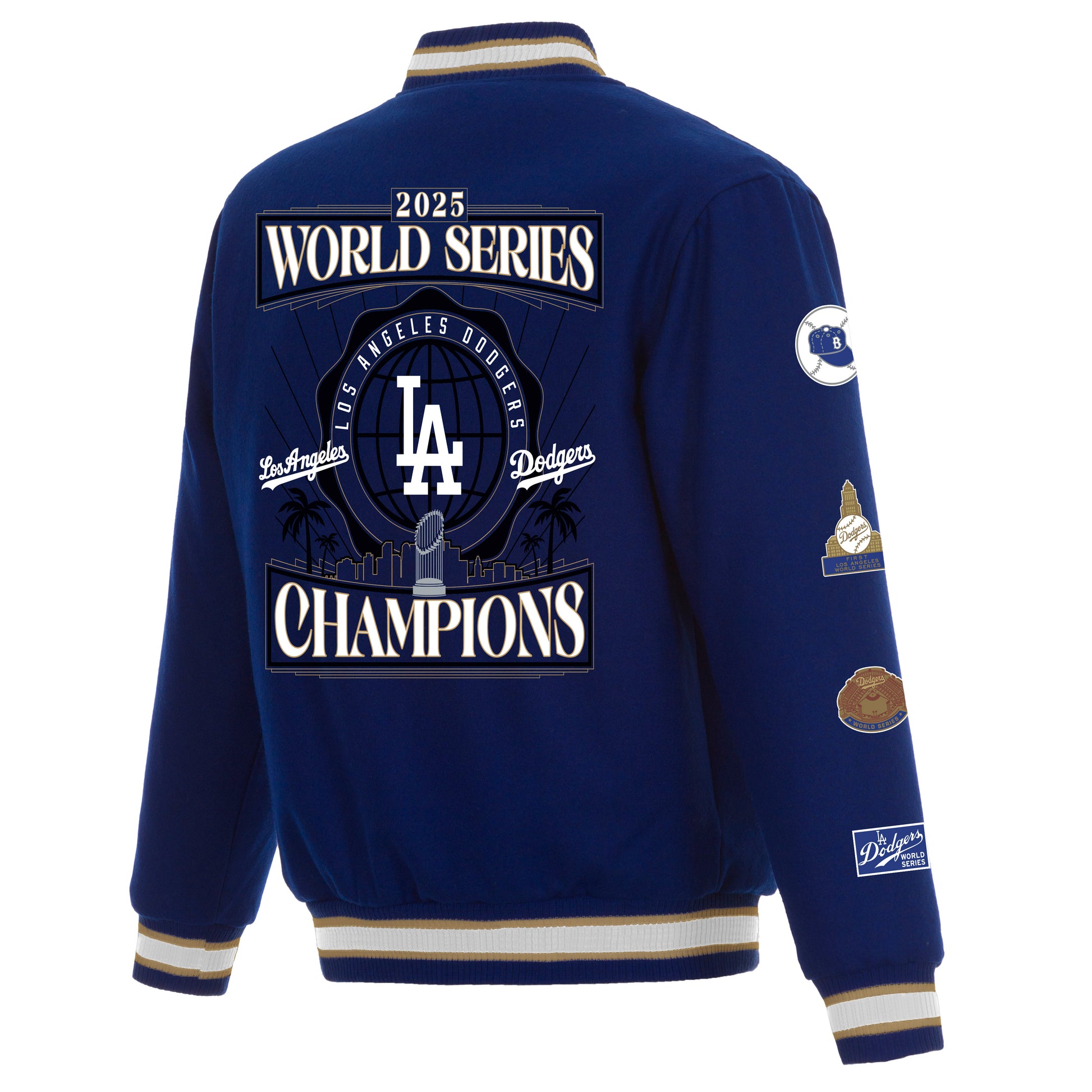 PRE-ORDER: Los Angeles Dodgers 2025 World Series Championship reversible wool varsity jacket in royal with nylon lining and embroidered logos.