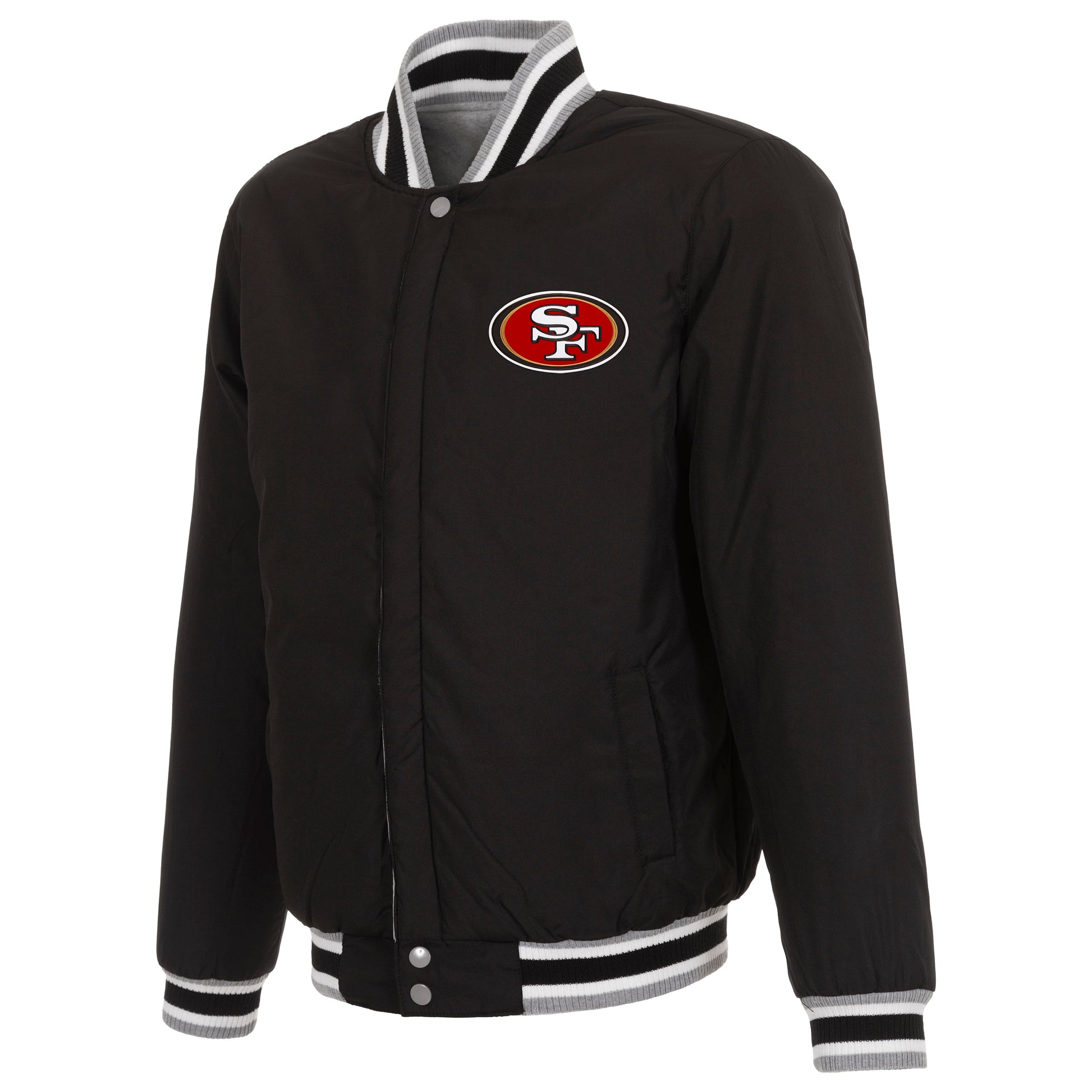 San Francisco 49ers reversible two-tone fleece jacket in grey and black with embroidered logos. Assembled in the USA. 100% polyester body, reverse nylon side, snap button closure.