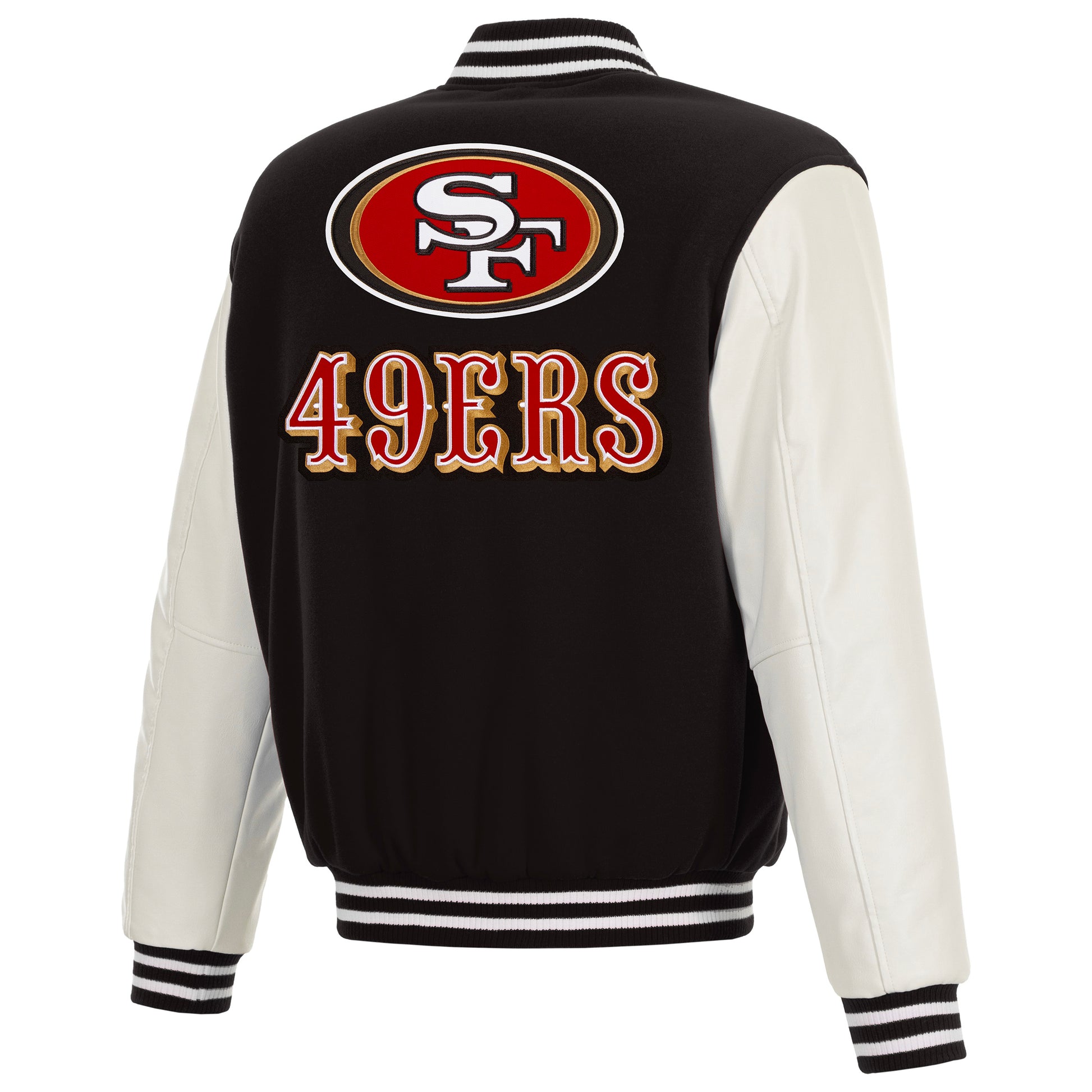 San Francisco 49ers reversible fleece jacket with faux leather sleeves in black and white with embroidered logos. Assembled in the USA. 100% polyester body, faux leather sleeves, snap button closure.
