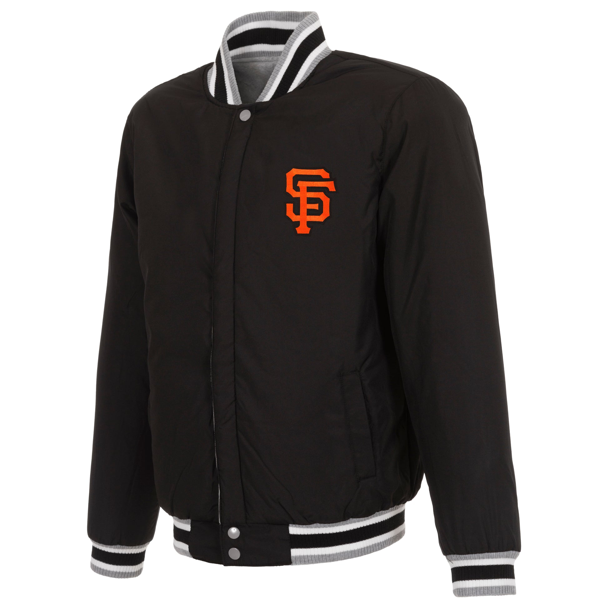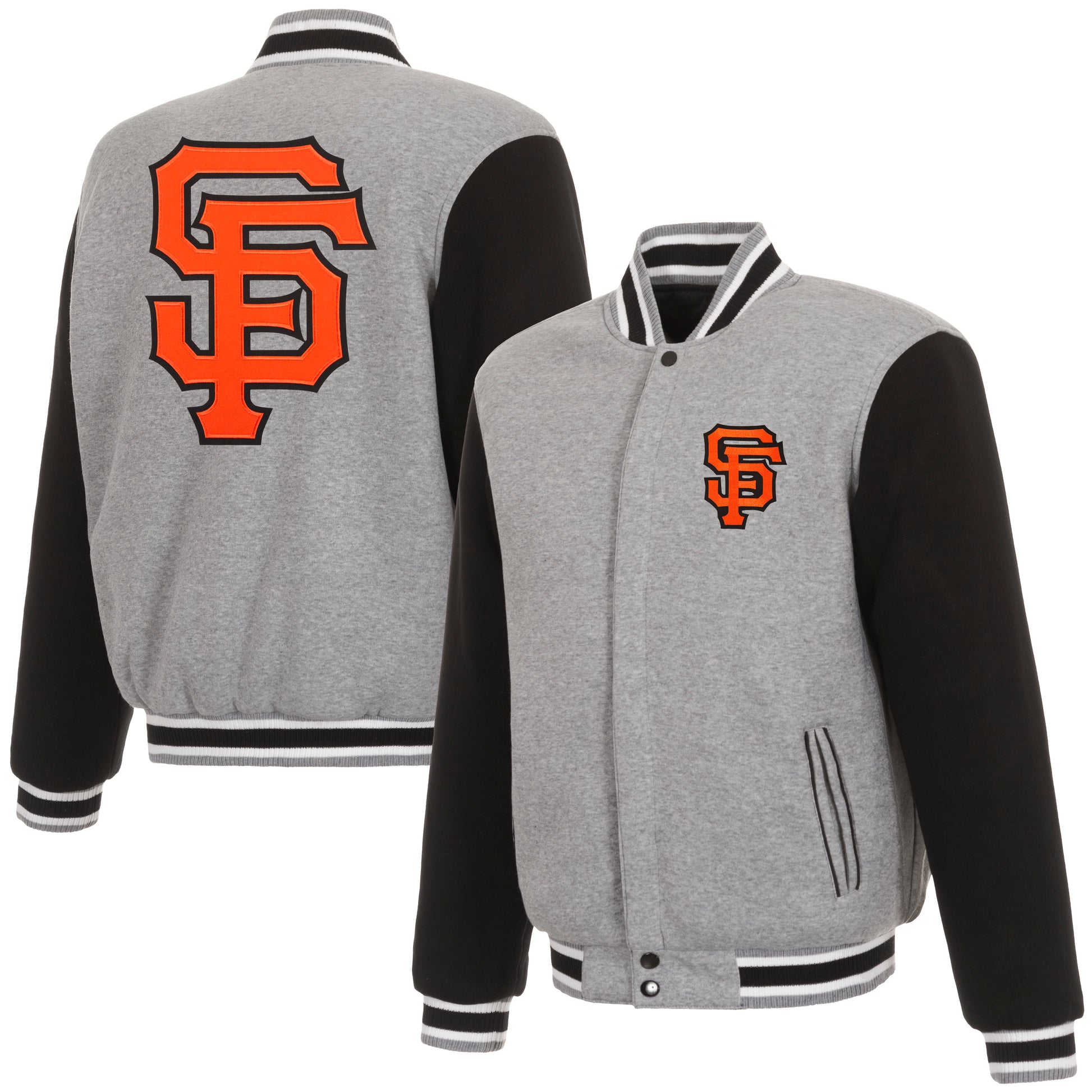 San Francisco Giants reversible two-tone fleece jacket in gray and black with nylon lining and embroidered logos. (Front and Back Logos)