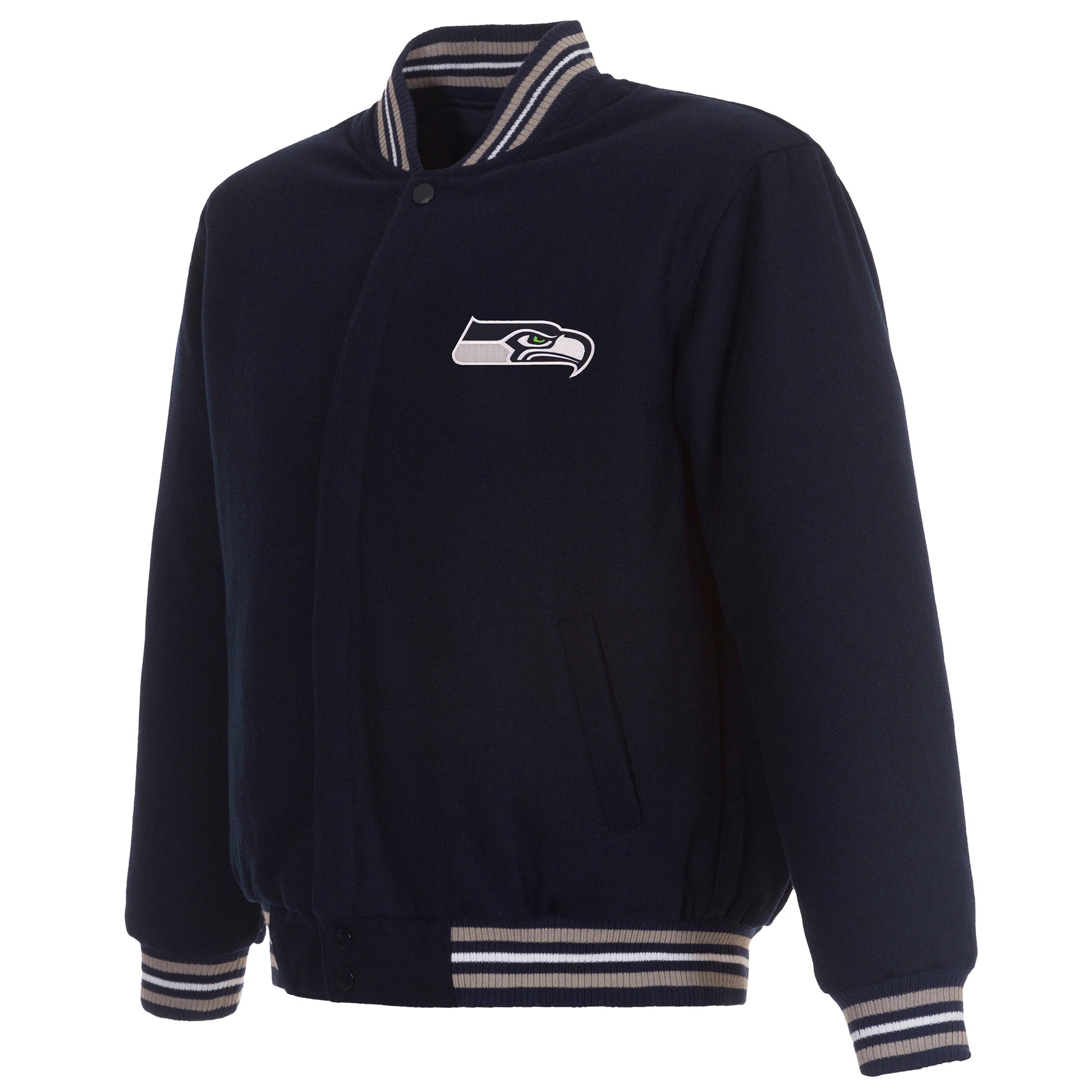 Seattle Seahawks All Wool Jacket with nylon lining in navy and grey with embroidered logos. Assembled in the USA. 55% wool 45% polyester body. Snap button closure.