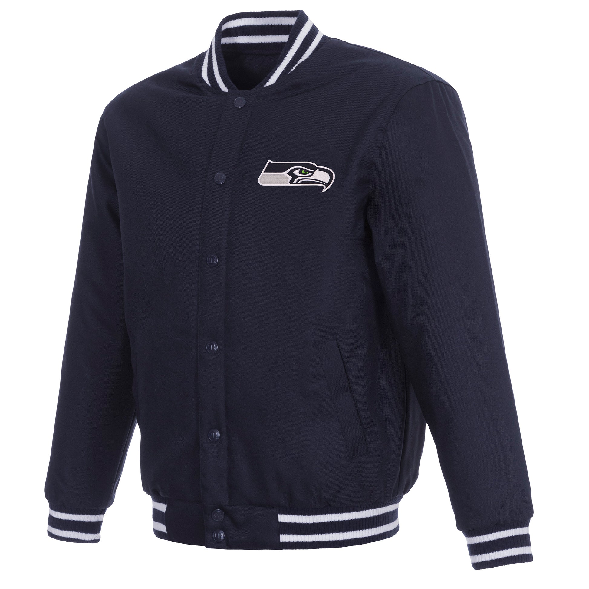 Seattle Seahawks poly-twill jacket in navy with quilted nylon lining and embroidered appliqué logos.