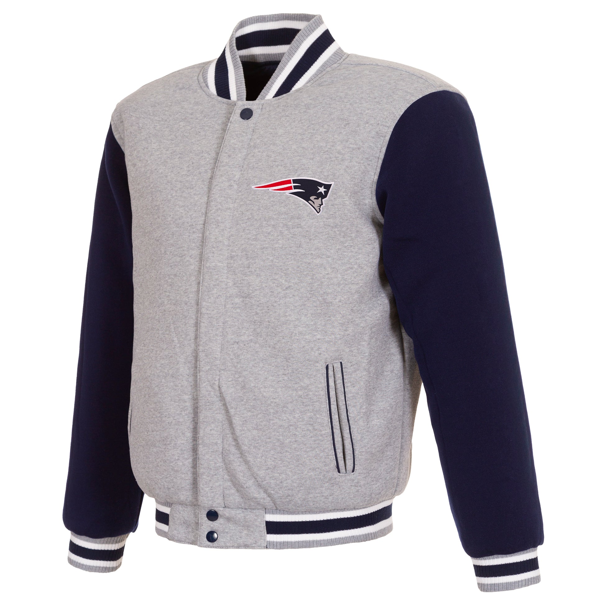 Seattle Seahawks reversible two-tone fleece jacket in grey and navy with embroidered logos. Assembled in the USA. 100% polyester body, reverse nylon side, snap button closure.