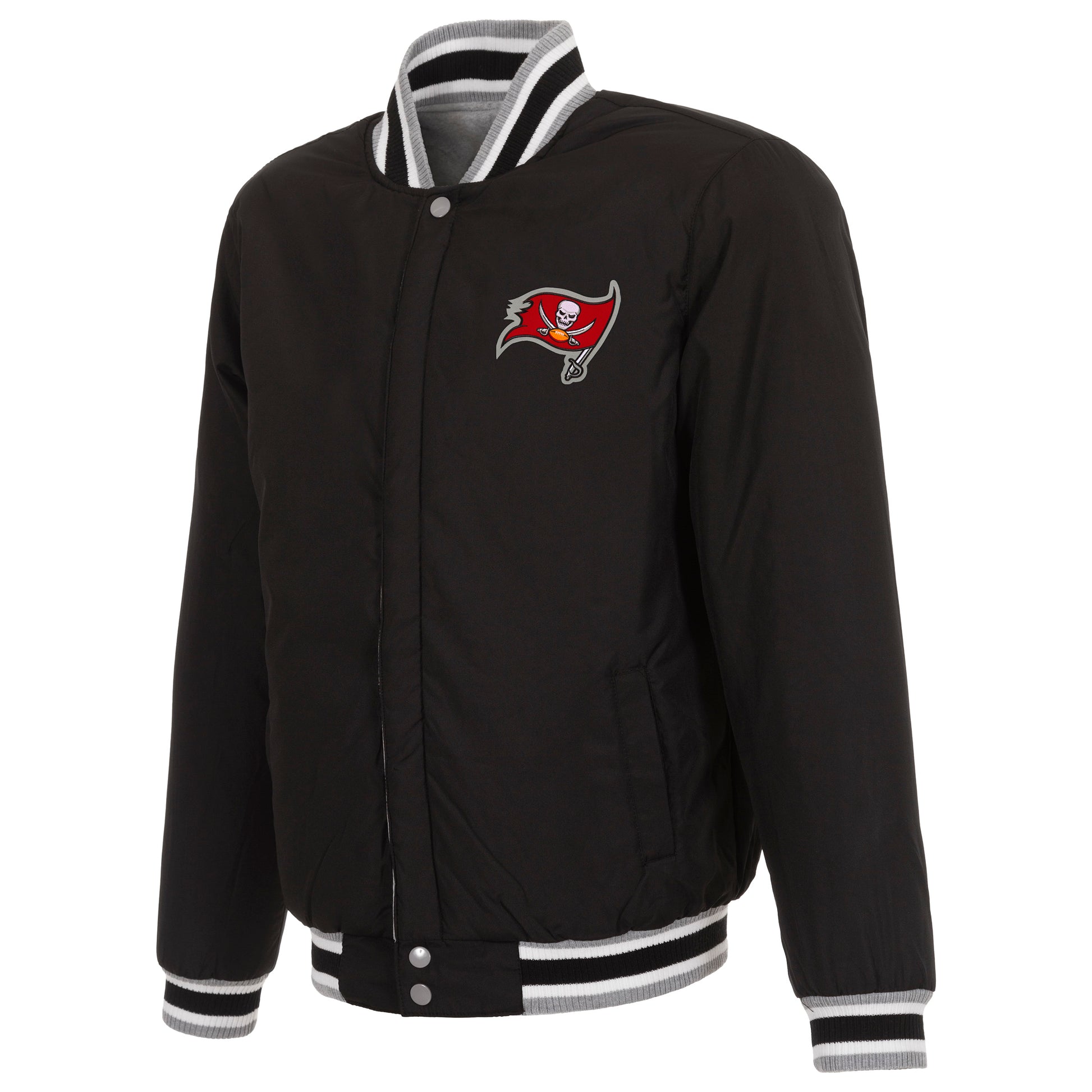 Tampa Bay Buccaneers reversible two-tone fleece jacket in grey and black with embroidered logos. Assembled in the USA. 100% polyester body, reverse nylon side, snap button closure.