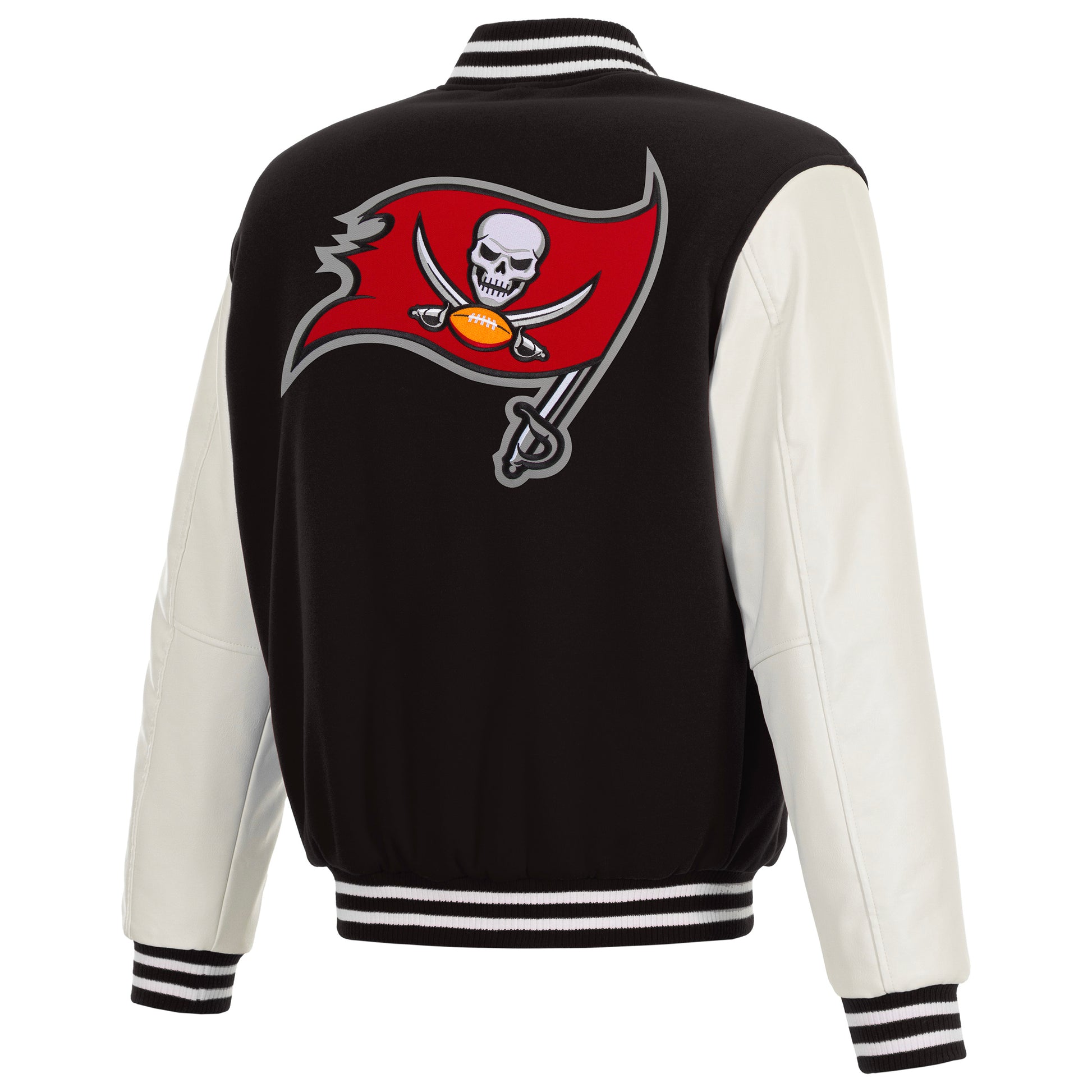 Tampa Bay Buccaneers reversible fleece jacket with faux leather sleeves in black and white with embroidered logos. Assembled in the USA. 100% polyester body, faux leather sleeves, snap button closure.