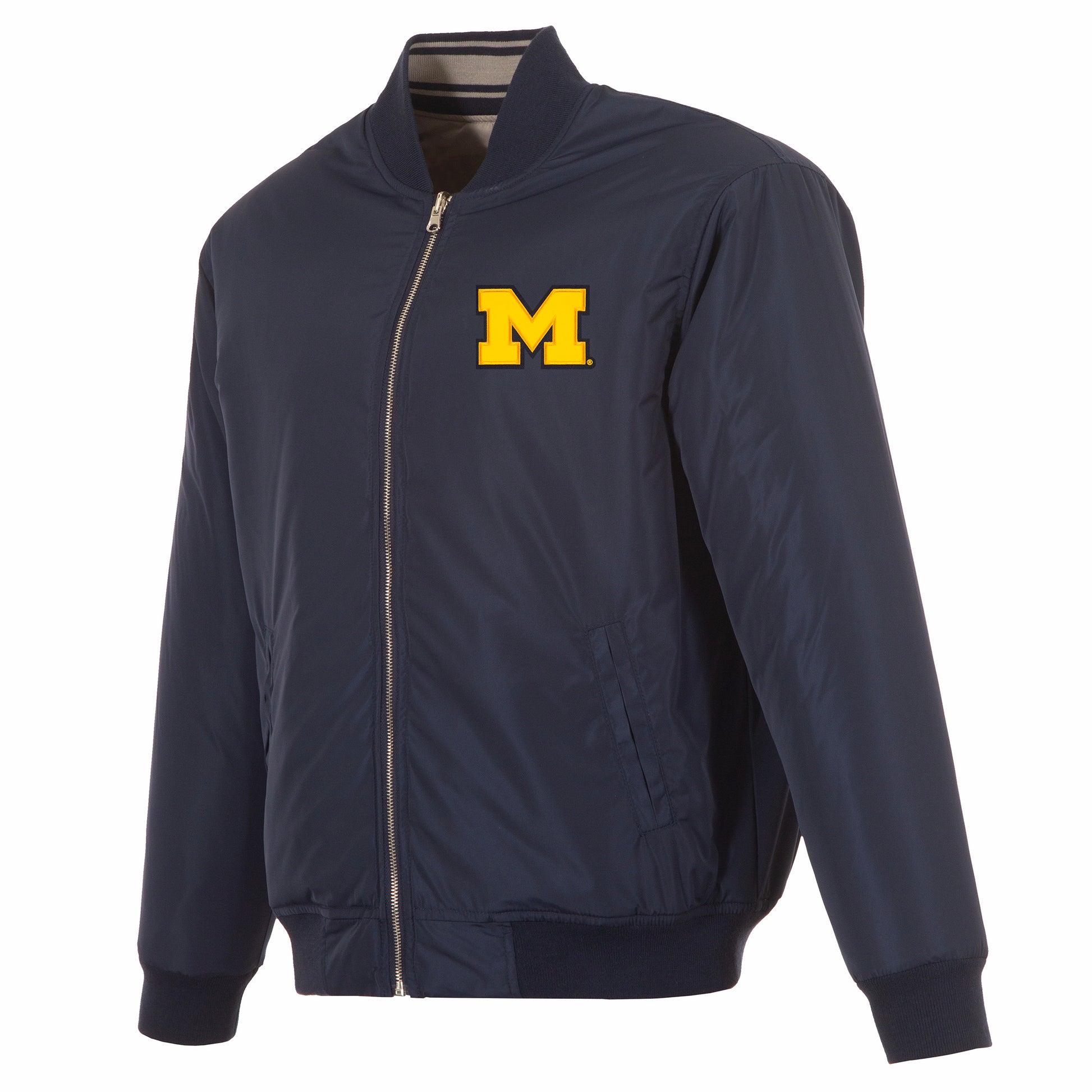 University of Michigan Reversible Flight Jacket in navy and grey with embroidered logos. Assembled in the USA. 100% Nylon, full length zip front.