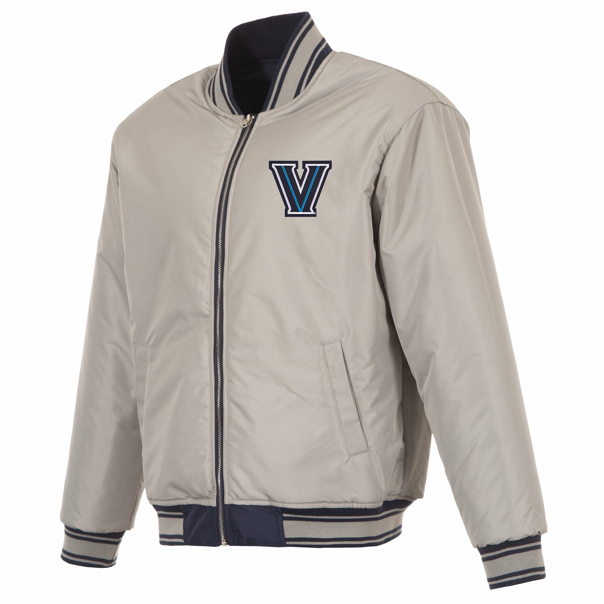 Villanova University Reversible Flight Jacket in navy and grey with embroidered logos. Assembled in the USA. 100% Nylon, full length zip front.