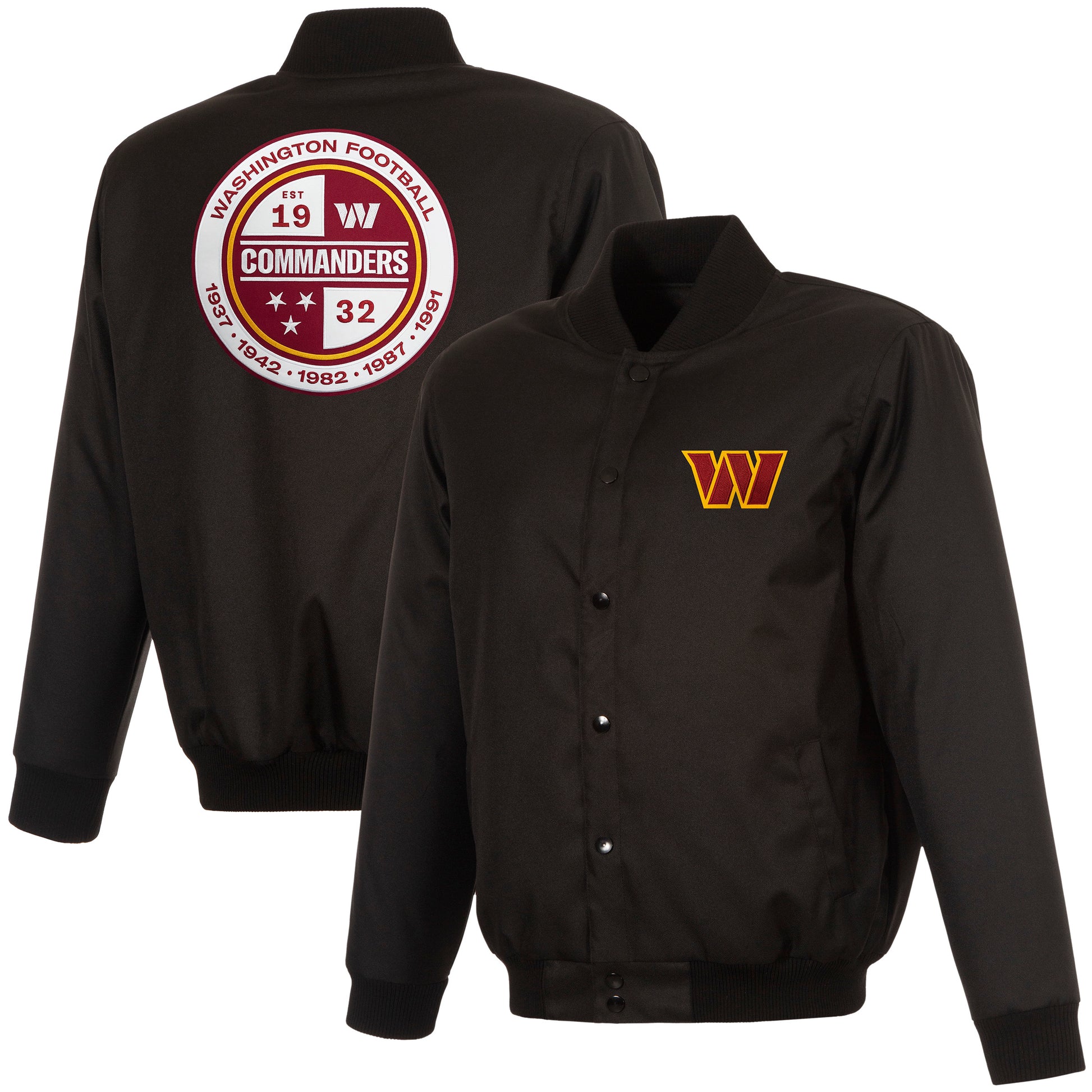 Washington Commanders Poly-Twill Jacket Jacket with nylon lining in black with embroidered logos. Assembled in the USA. 100% polyester body, snap button closure.